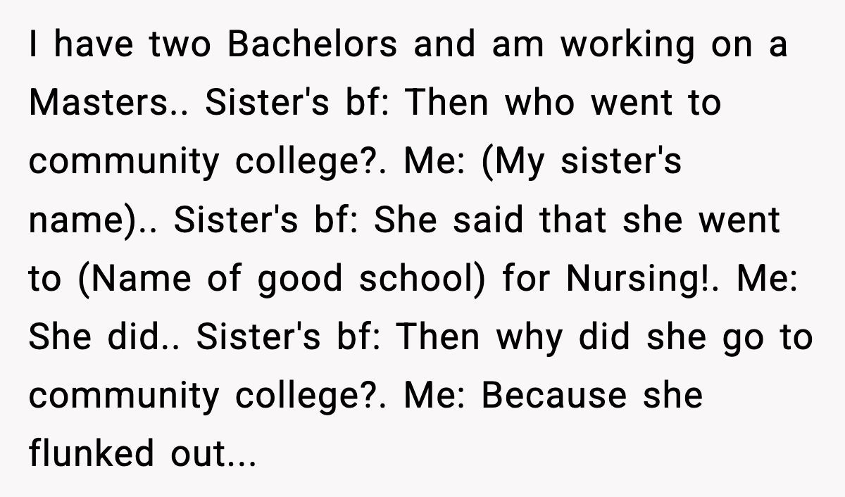 Family gatherings can spark drama faster than a reality show, but this Redditor’s cookout chat turned into a truth-telling tornado. When her sister’s boyfriend, a pharmacist, assumed she went to community college, she clarified her two bachelor’s degrees and master’s program—outing her sister’s lies about attending a top nursing school. The sister’s now crying sabotage, but was the Redditor’s honesty a mistake or a calculated jab?