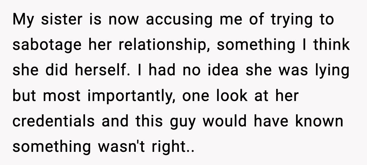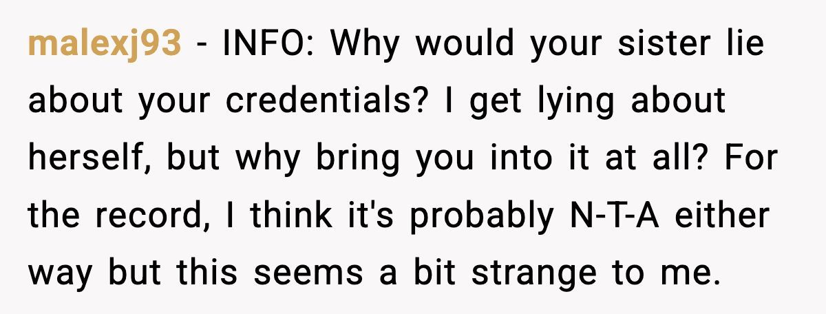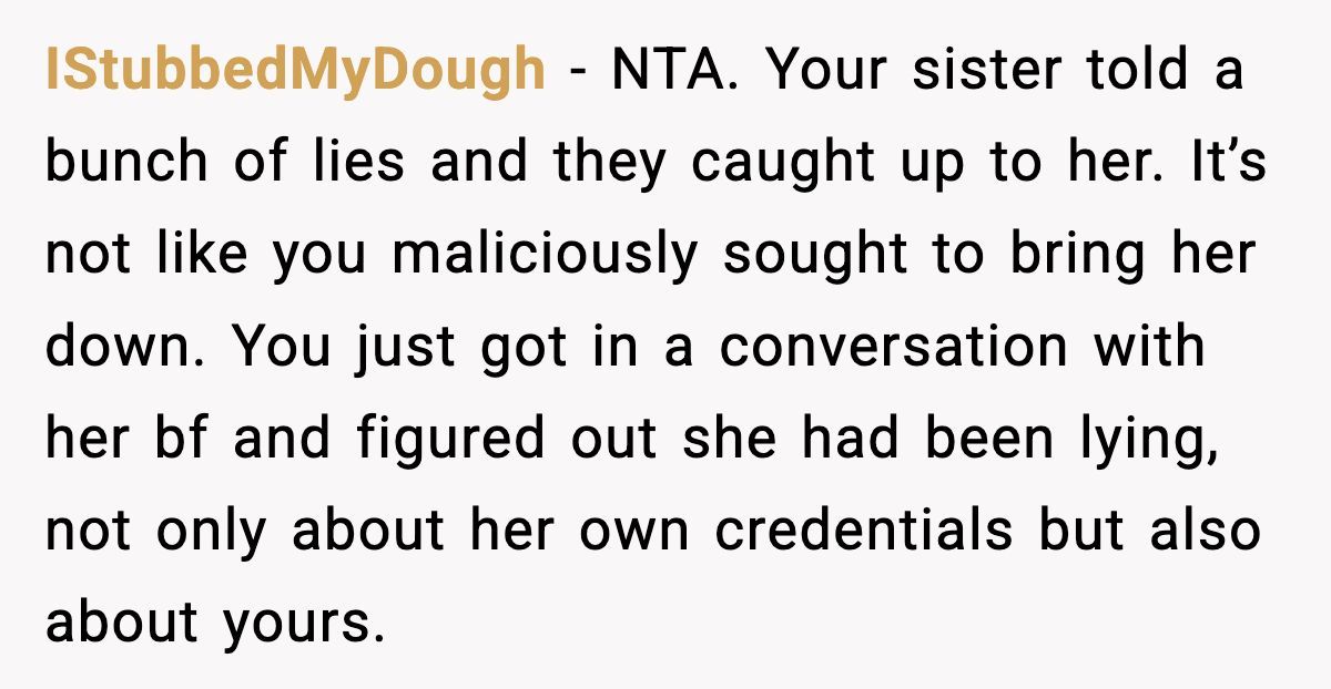 The sister might argue the Redditor didn’t need to air her dirty laundry, especially since the lies didn’t hurt anyone yet. A private heads-up could’ve avoided the public fallout. But the Redditor, blindsided by the boyfriend’s confusion, was just correcting false info about herself—hardly a crime. Her sister’s decision to lie about both their credentials set the stage for this mess, and expecting her to play along without warning was a risky move.