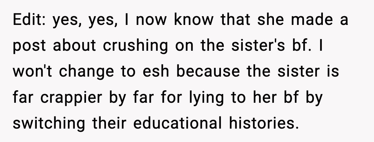 This Reddit tale had all the ingredients of a spicy family scandal—unprovoked honesty, academic embellishments, and a sister who forgot that lies can unravel fast in front of the wrong audience.