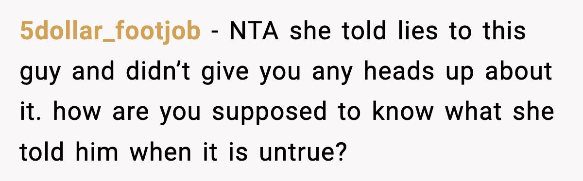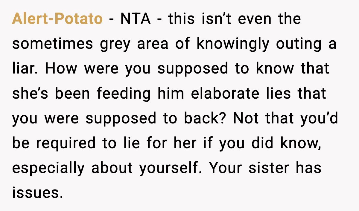 Another user said OP had no idea she was supposed to protect a false narrative, and she shouldn’t be expected to lie.