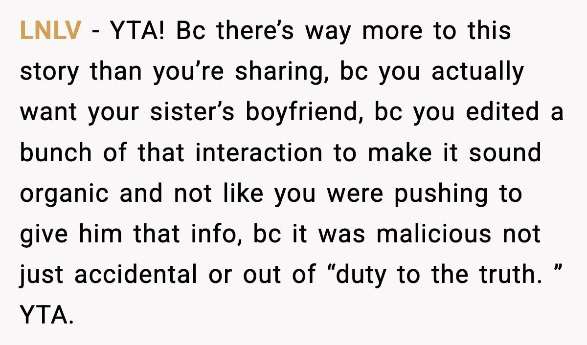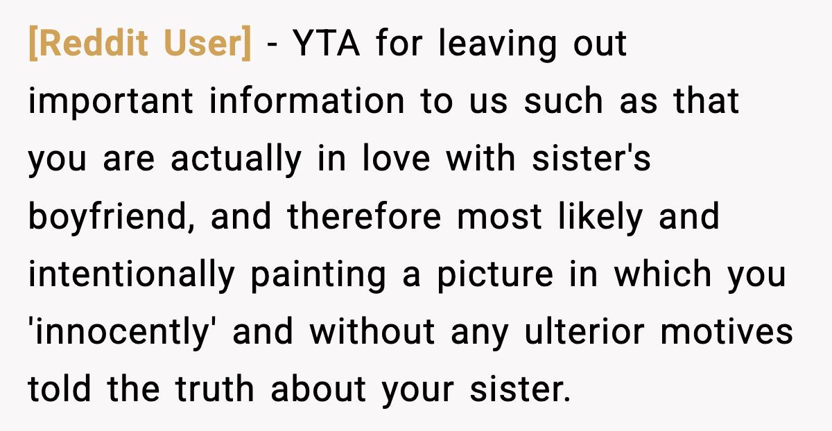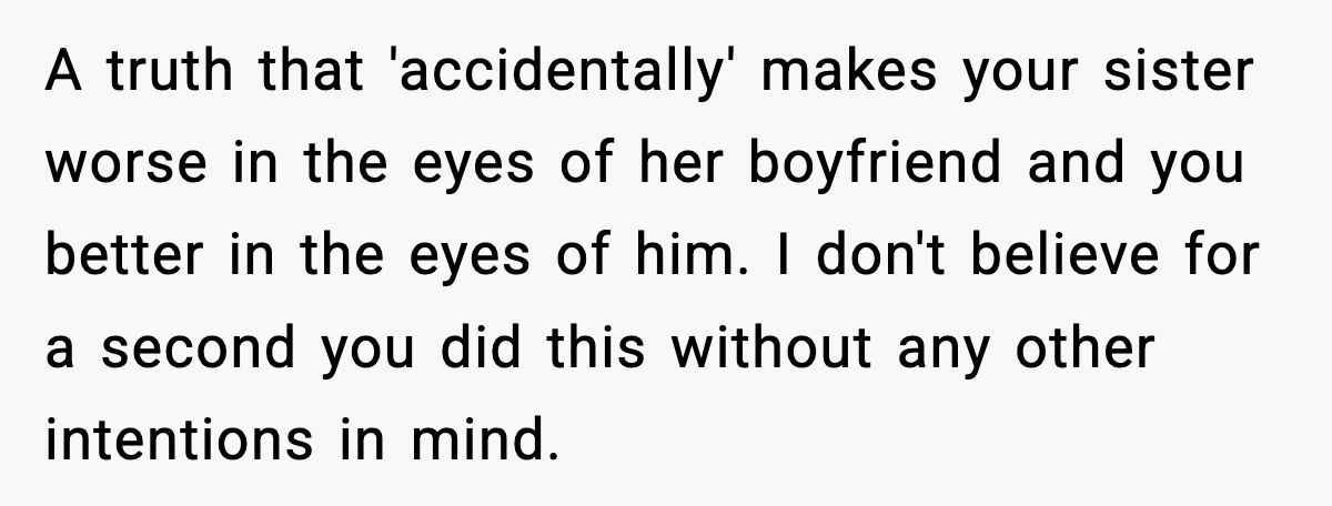 This comment suggested OP strategically exposed her sister to make herself look better in front of the guy.