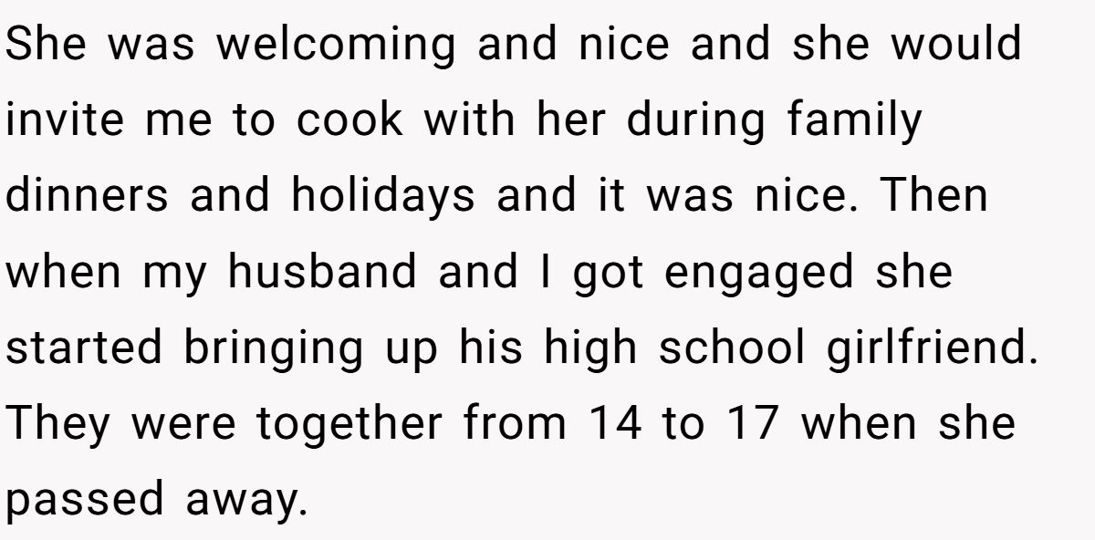 Imagine stirring a pot in your mother-in-law’s kitchen, bonding over family recipes, only to hear, yet again, how your husband’s late high school sweetheart was a culinary queen. That is the bitter dish a 26-year-old Redditor was served when her mother-in-law (MIL) could not stop comparing her to a past love lost tragically young.