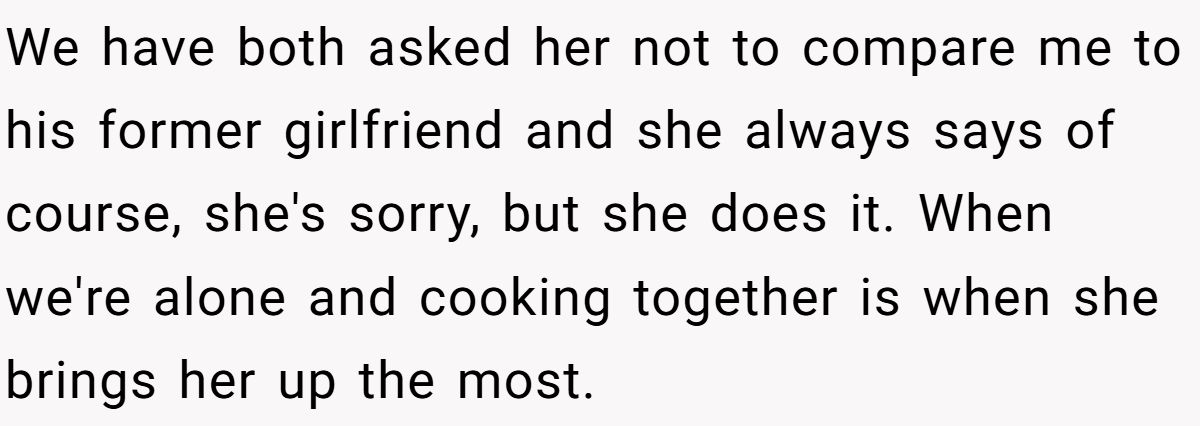 The comparisons, shared mid-cooking with comments like “she did it this way” or “she could have been a chef,” stung, especially since they continued despite apologies and clear requests to stop. Refusing to cook together again might look like a cold shoulder, but it is a boundary born from feeling like a runner-up in her own marriage.