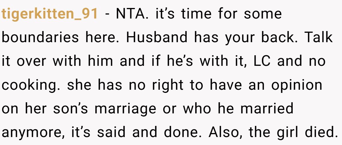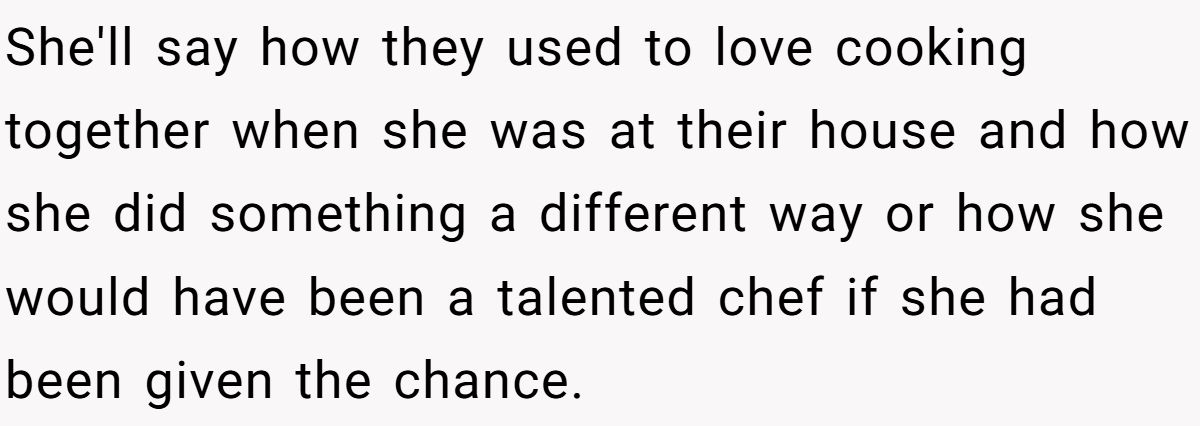 From MIL’s perspective, losing a young person she loved like a daughter clearly left a mark, and cooking may trigger those memories. Her apologies, backed by her husband’s intervention, suggest she is trying to change, but old habits are hard to break.