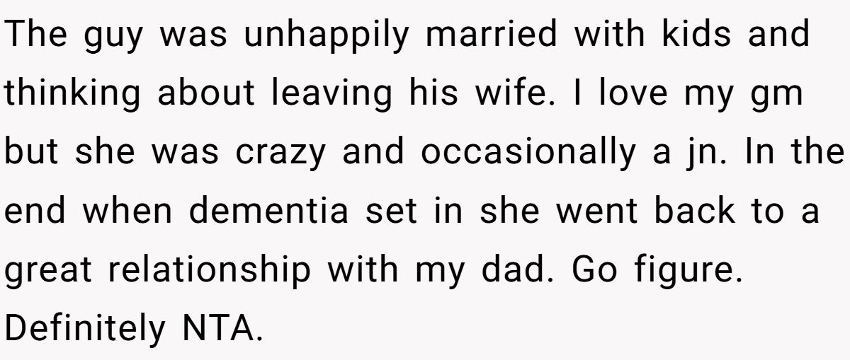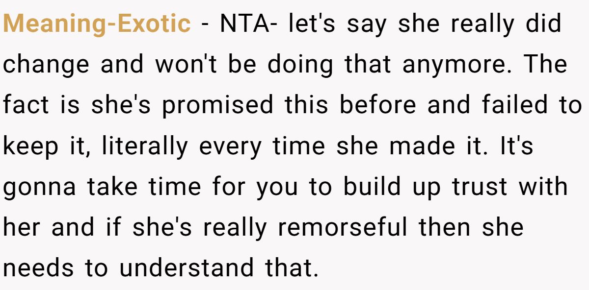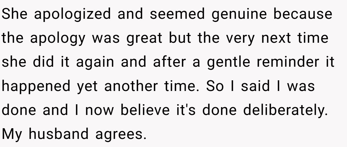 As relationship expert Dr. Susan Heitler explains, “Unresolved grief can lead to behaviors that unintentionally hurt others” (Psychology Today). Her apologies seem sincere, but her inability to stop suggests she is either stuck in her grief or, as the Redditor fears, deliberately stirring the pot. Either way, it is a trust-breaker.