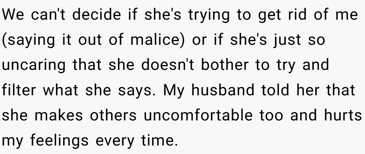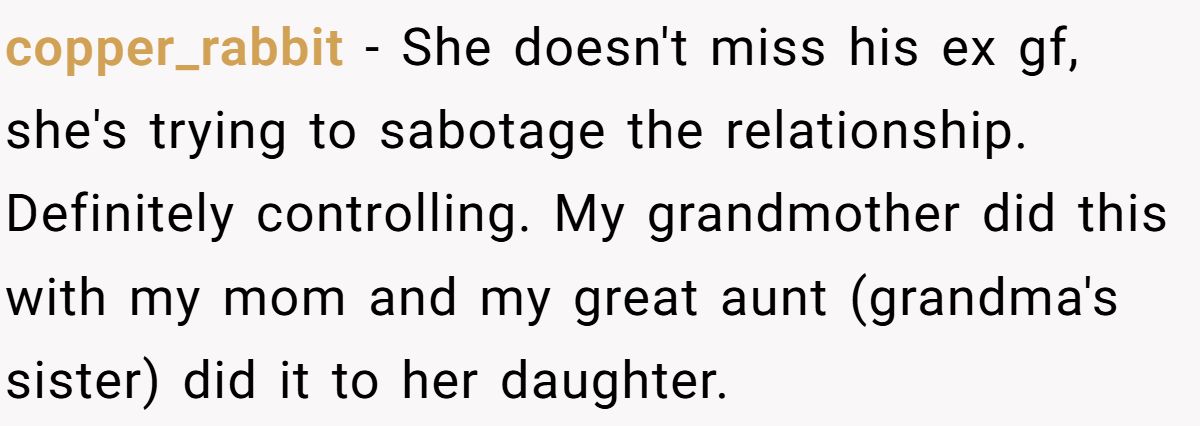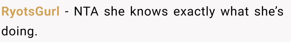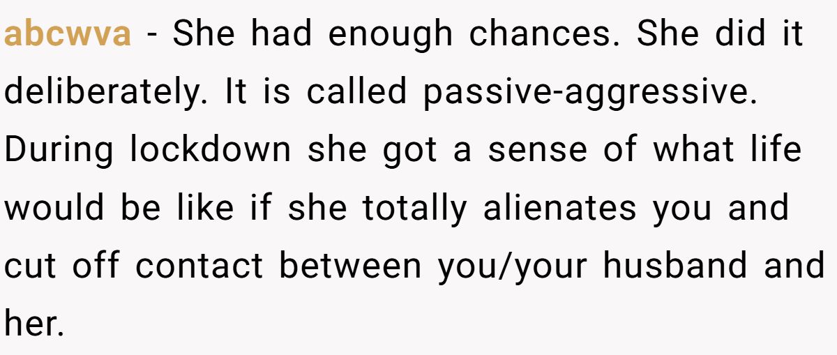 Meanwhile, others believed the mother-in-law was fully aware of her manipulative behavior and likely trying to undermine the marriage, and they supported setting firm boundaries or going no contact if needed.