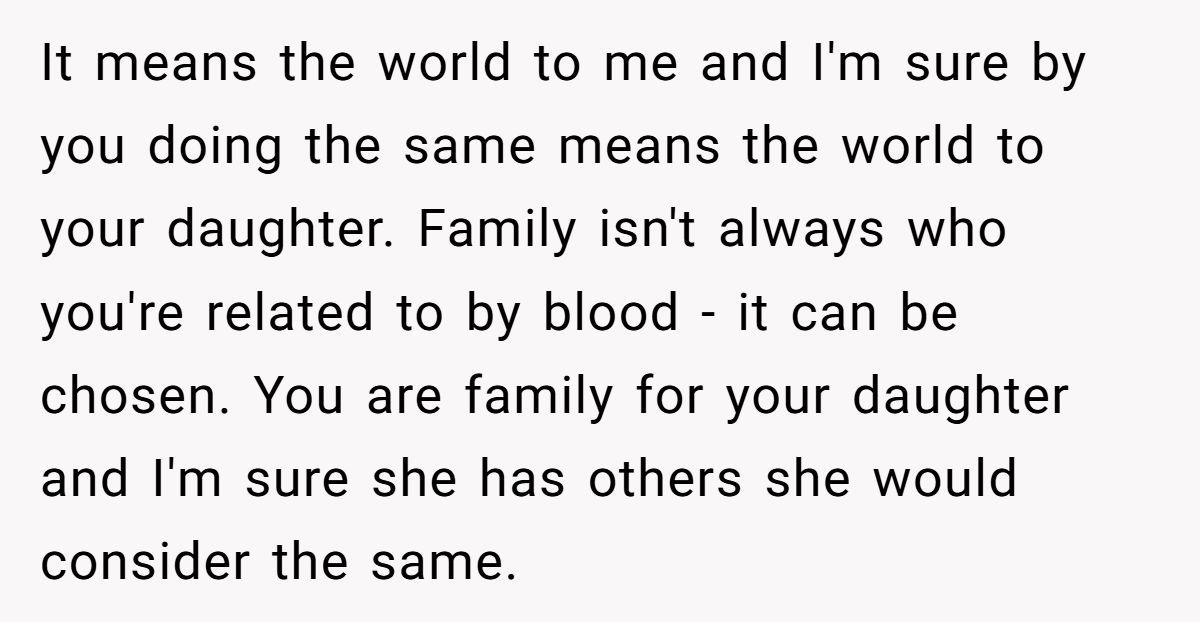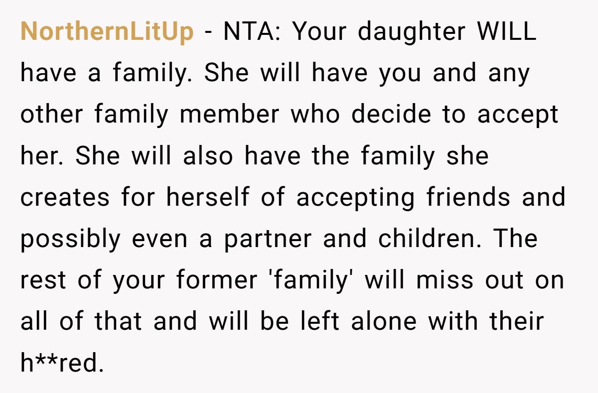 Commenters emphasized that the daughter will find family in her father and accepting friends, not blood relatives who reject her