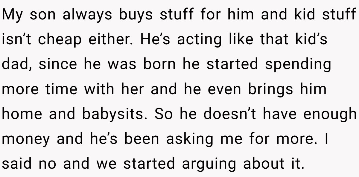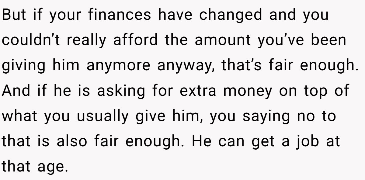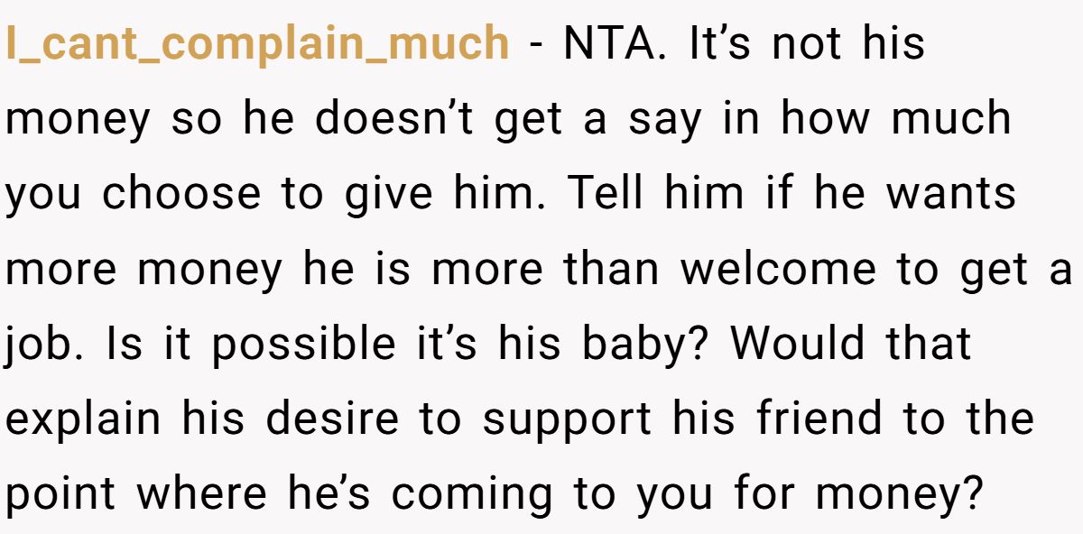 Some Redditors questioned why you gave him so much money to start with and wondered if you were only cutting it because you didn’t like how he spent it. Others asked if he could be the baby’s father or suggested he get a job if he wants more.