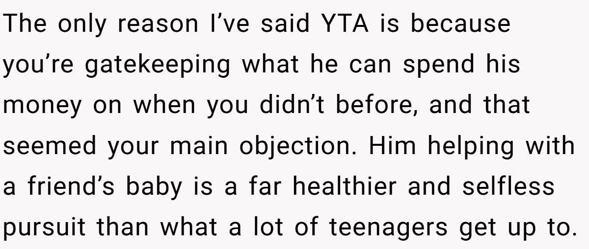![Dad Punished His Son for Spending Money on a Friend’s Baby - Reasonable or Out of Line? [Reddit User] − I would say YTA only because your issue is how he’s spending his money, rather than the amount. I mean what do you want a teenage boy to spend his money on instead, are you aware what teenagers sometimes spend money on and that it can be wasted money anyway? Lol.](https://dailyhighlight.com/wp-content/uploads/2025/07/2131245-13.jpg)