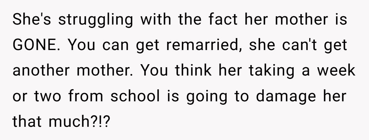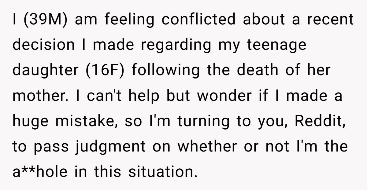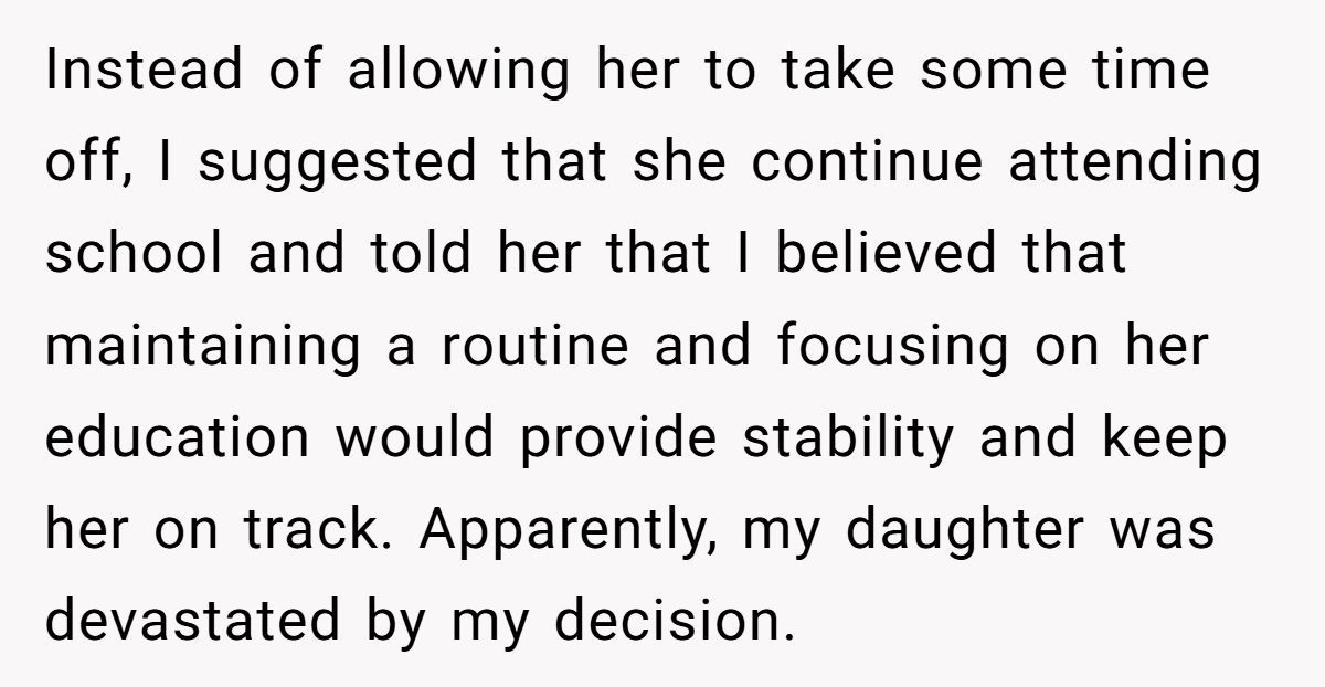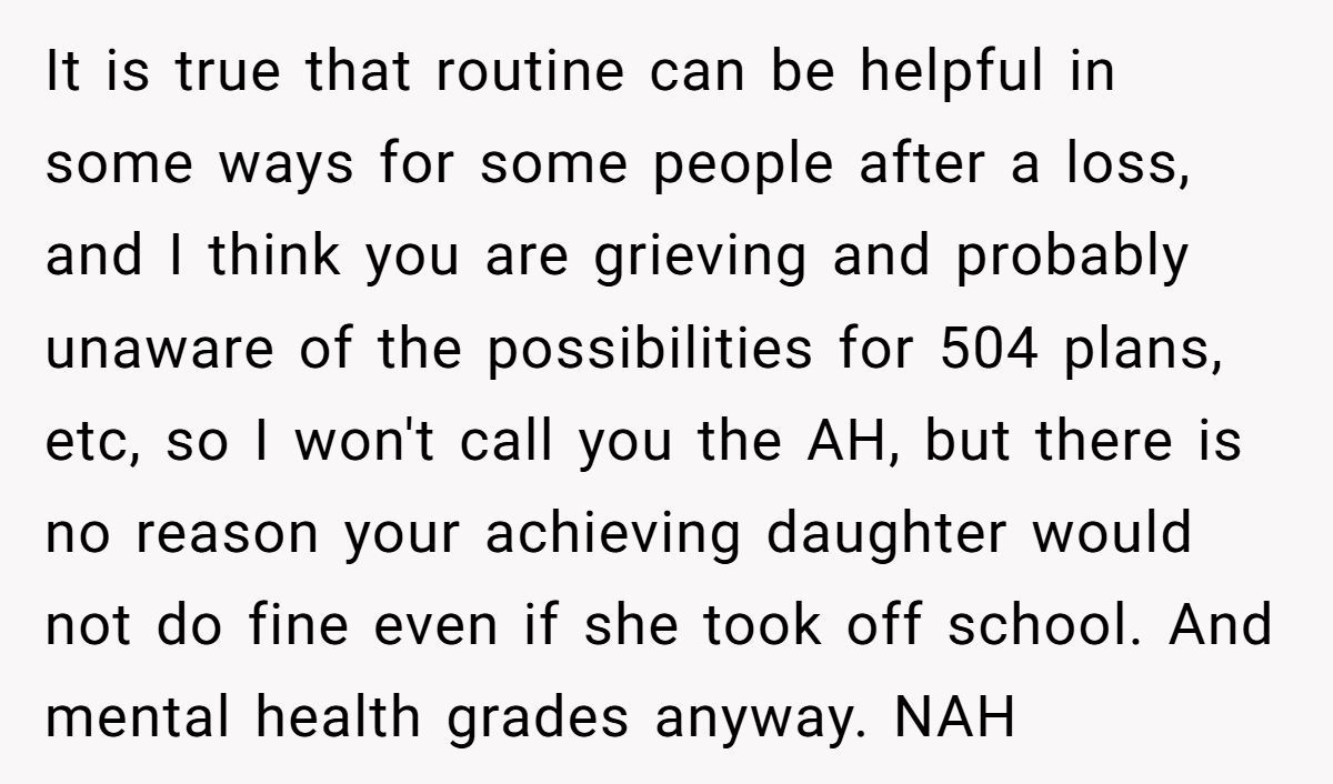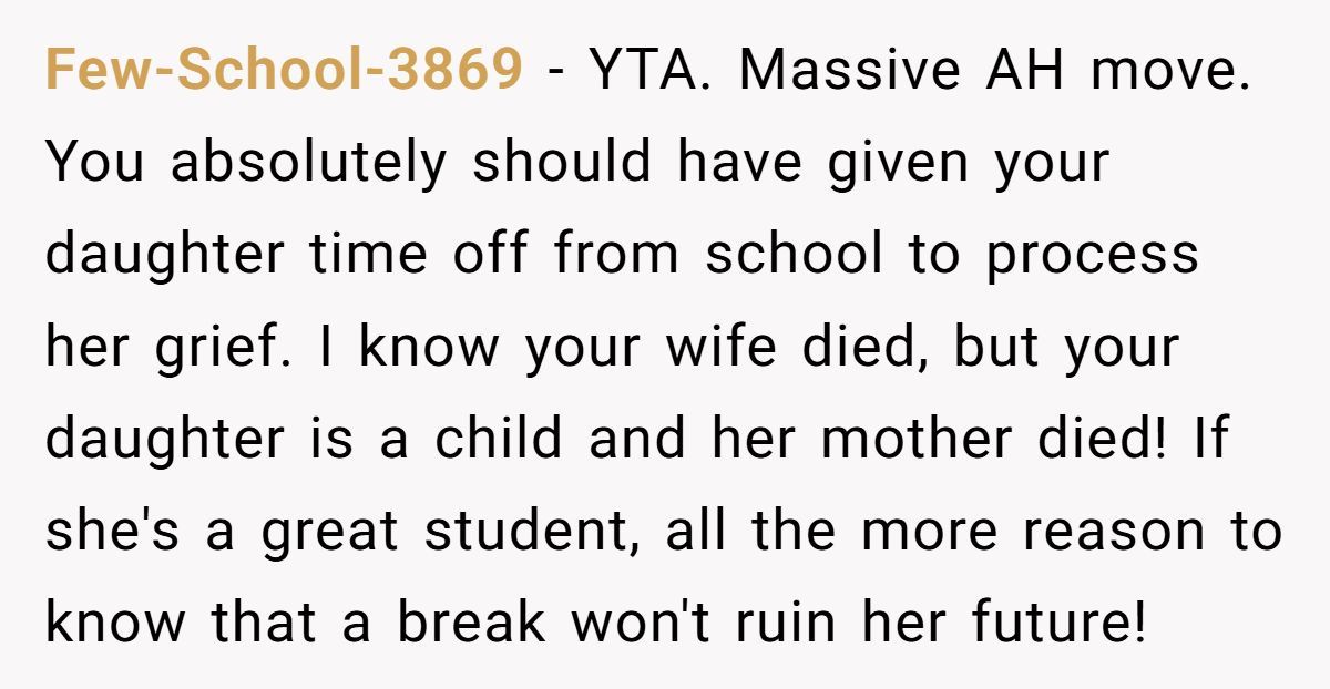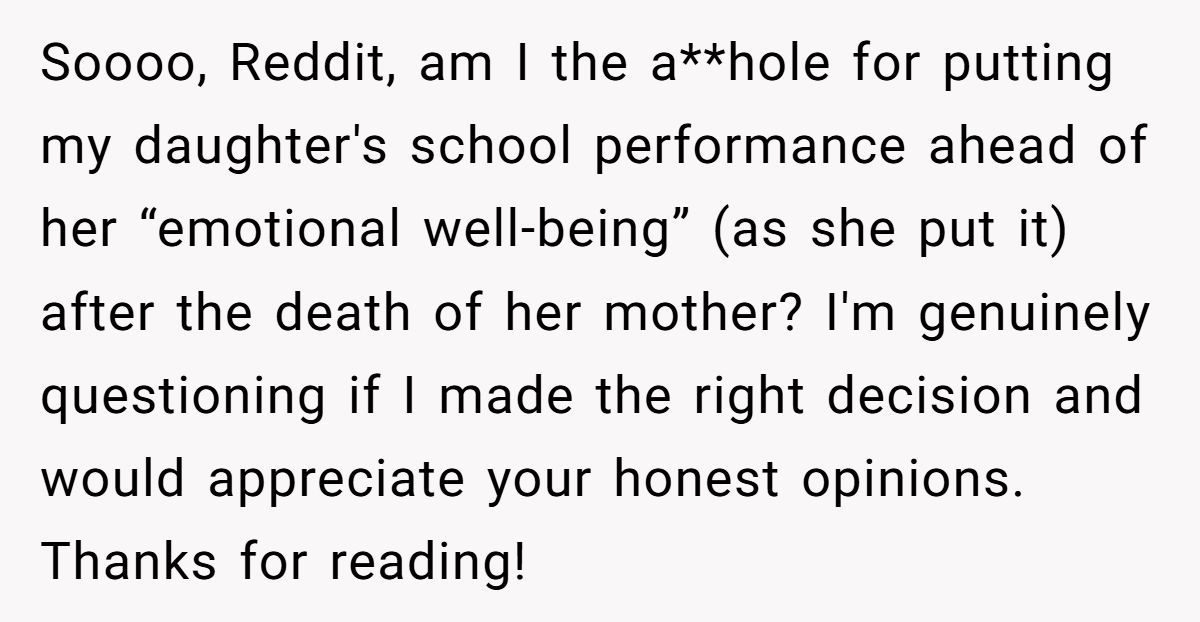 One Redditor stumbled into heartbreak when his daughter asked to take time off school after her mother passed away—and he said no. Instead, he encouraged her to stick to routine, believing grades over grief would help her cope.