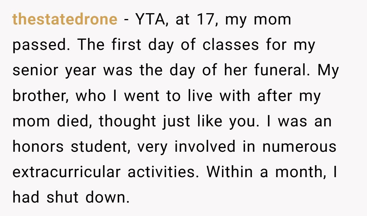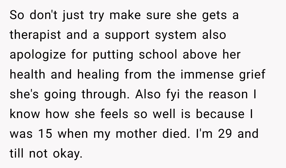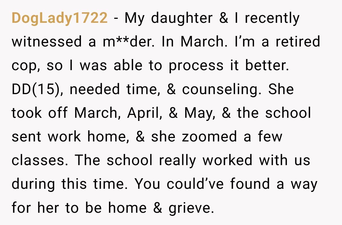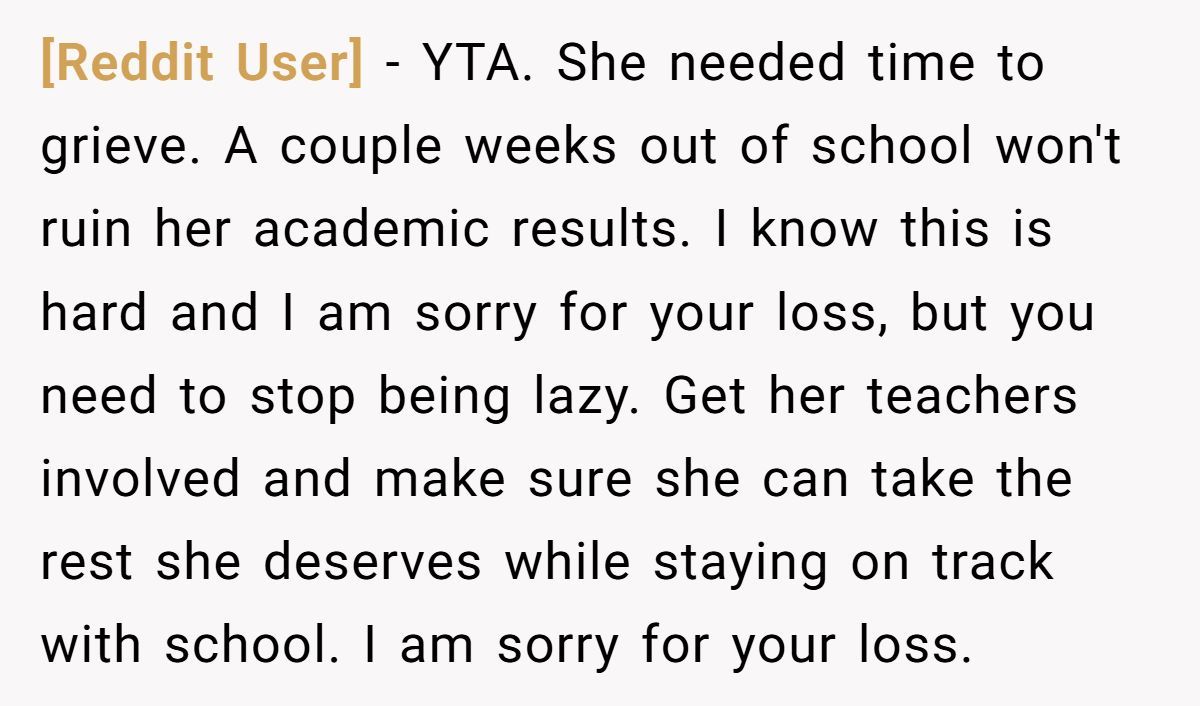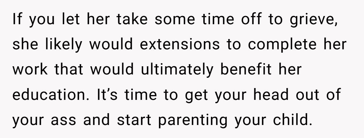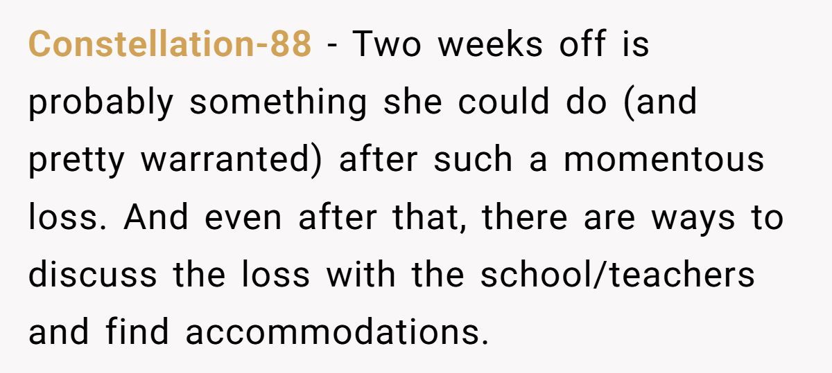 Two weeks of silence later—no school break, no support letter, no counseling referral—the emotional gap between them expanded. Now readers are crying foul. Want the full grief-versus-grade clash? Dive into the original post below.