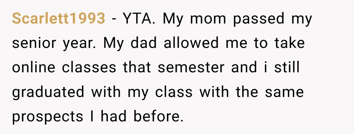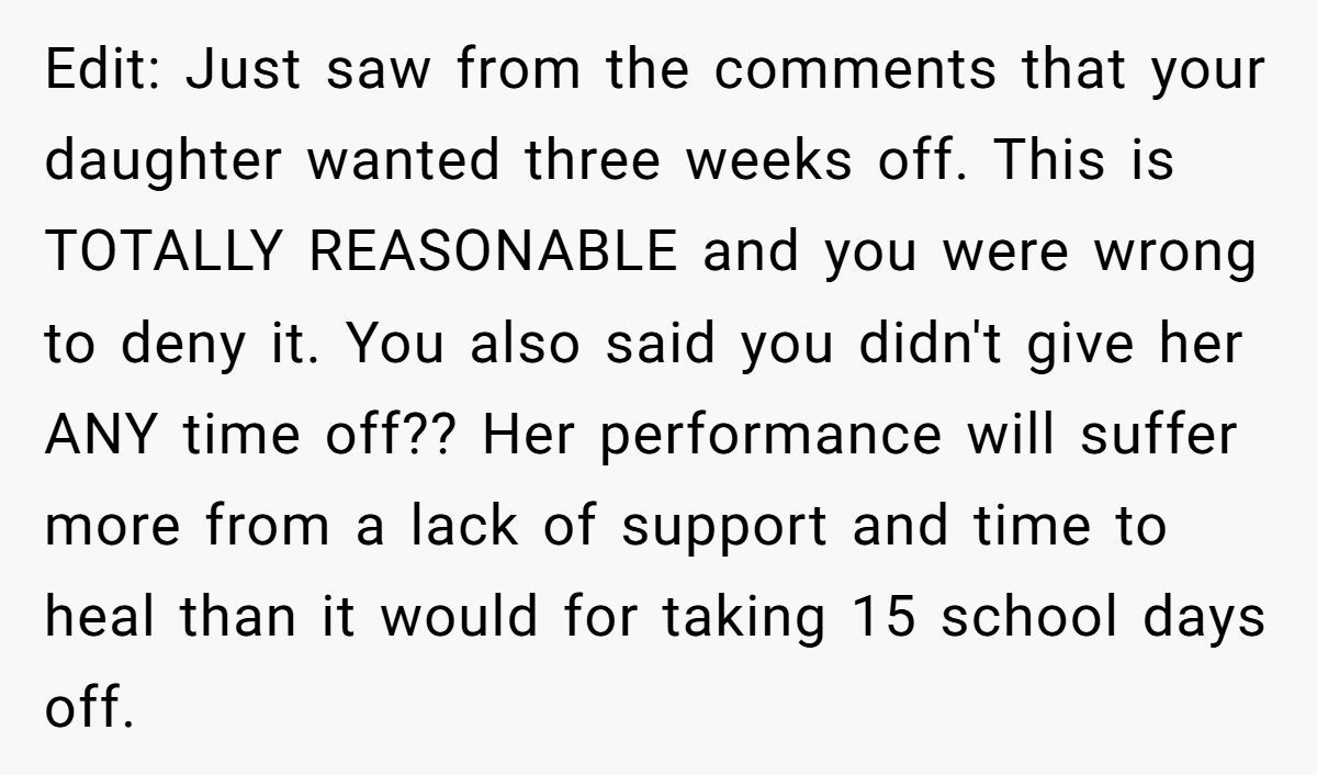 These Redditors suggested school accommodations like online classes or extensions, arguing a short break wouldn’t derail her academics