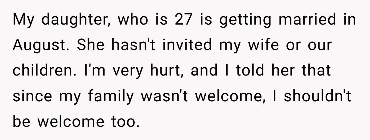 A Reddit dad found himself in the middle of a wedding day disaster—and this one doesn’t involve flowers or cake. He was all set to support his daughter on her big day… until she handed him an invitation with a painful caveat: his wife and young children were not invited.