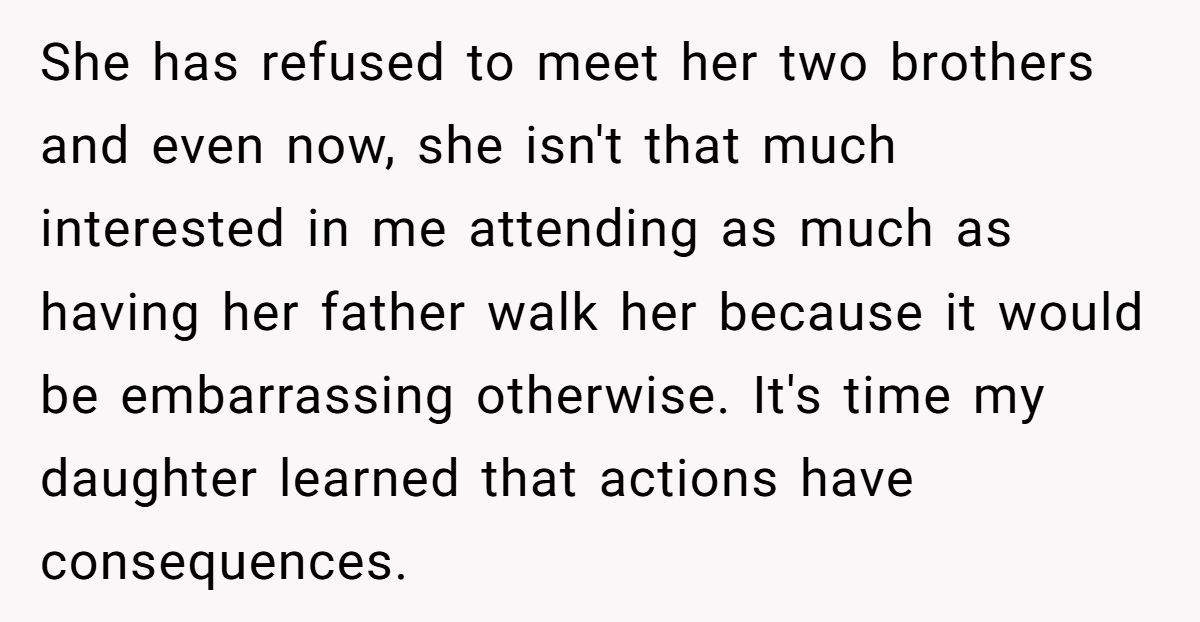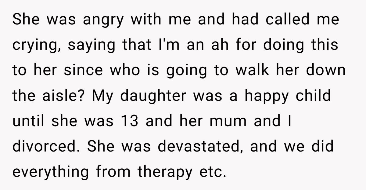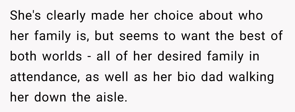 After reading this post, I sat with a heavy heart. This isn’t just a family squabble—it’s a slow-burning heartbreak years in the making. A father who once was everything, now reduced to an awkward symbol for an empty seat at the altar. A daughter who can’t forgive the past, but still needs a familiar hand to walk her forward.