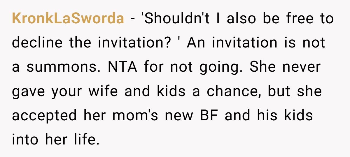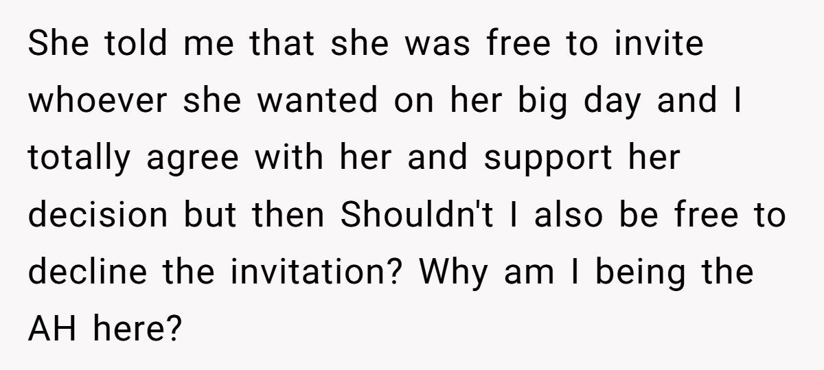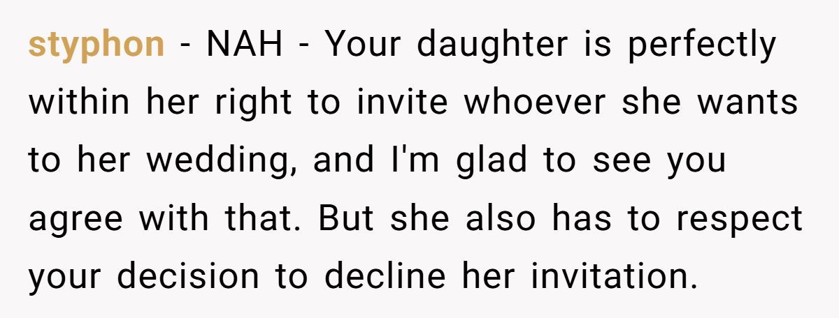 Was he wrong to decline, or justified in defending his family? How would you navigate a wedding snub tied to old wounds? Share your thoughts below!