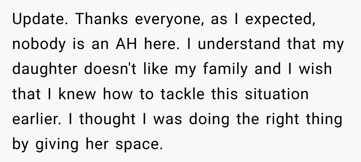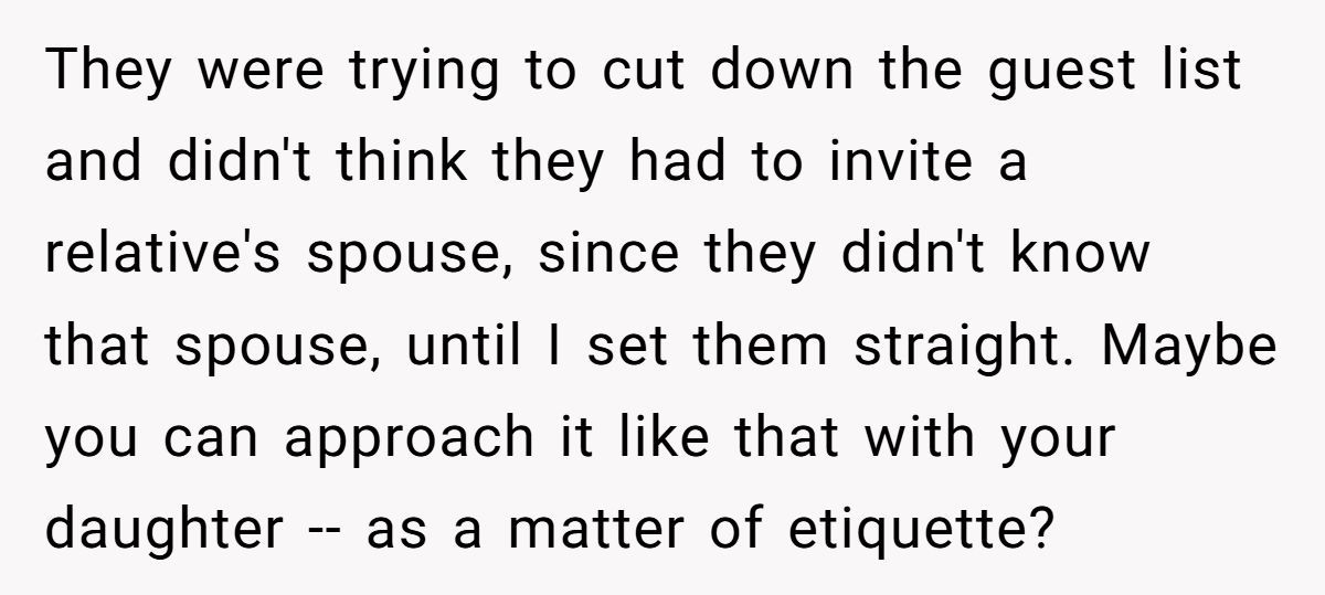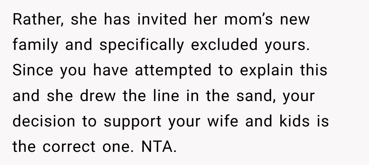 These commenters claimed the daughter’s exclusion was unfair, advising the Redditor to stand by his family