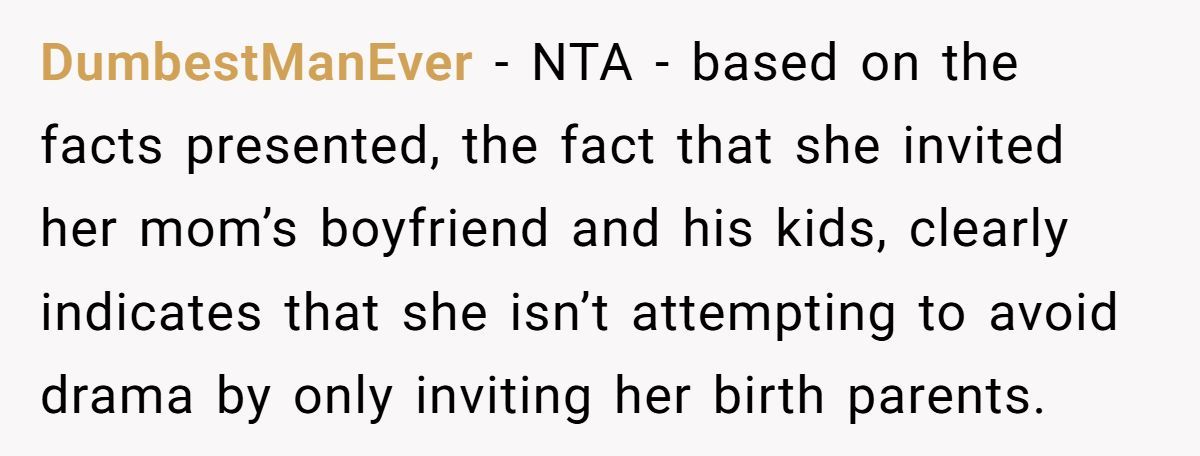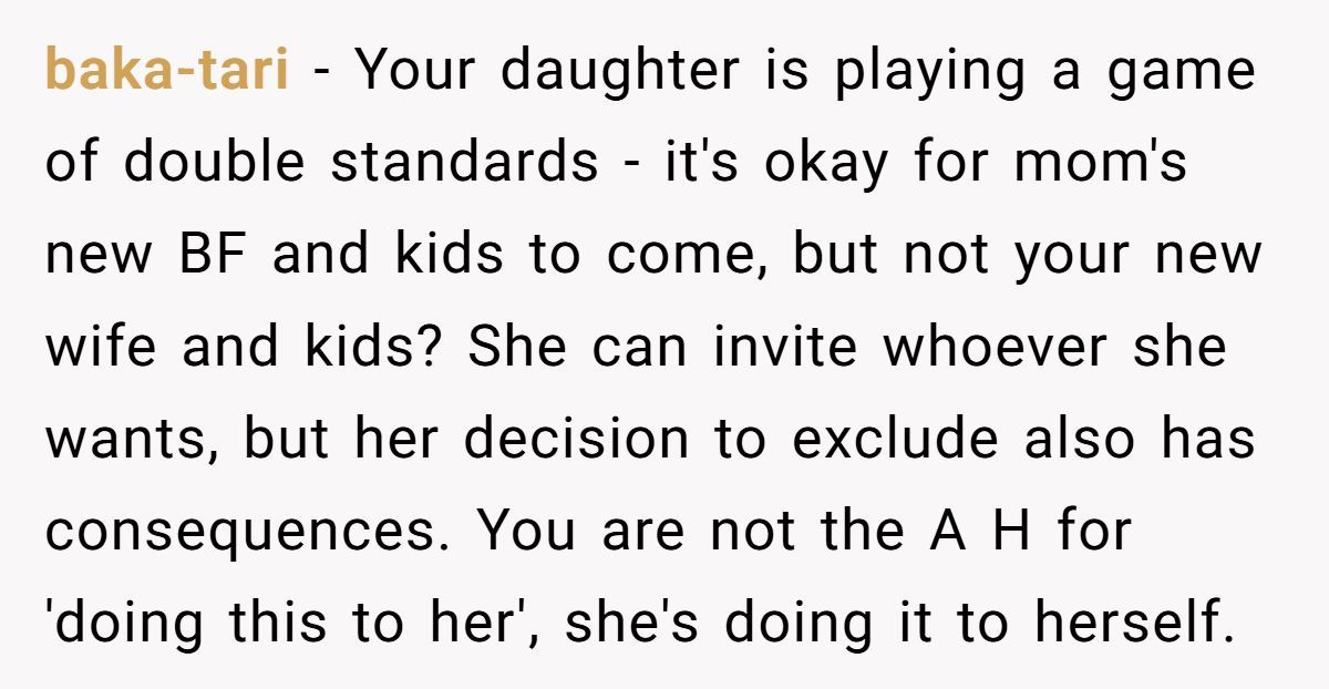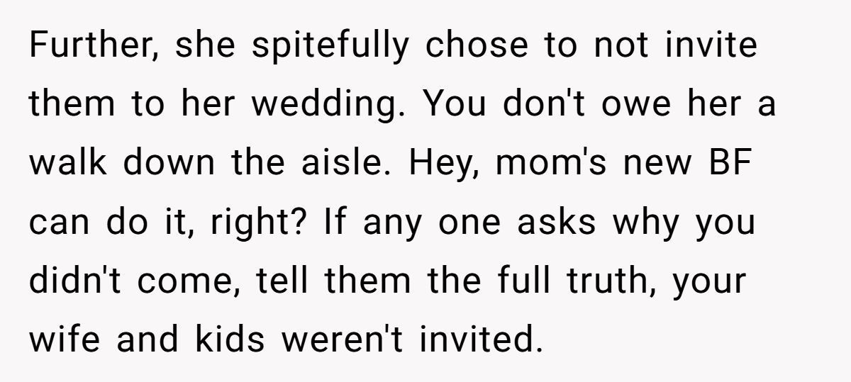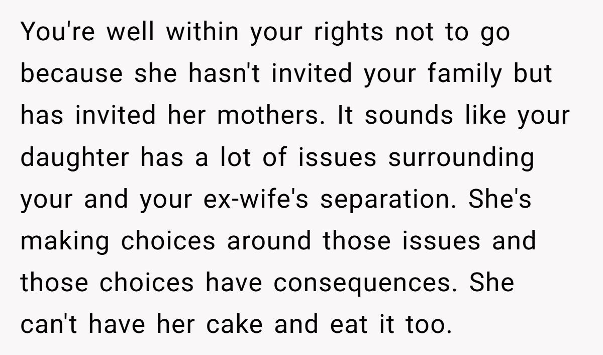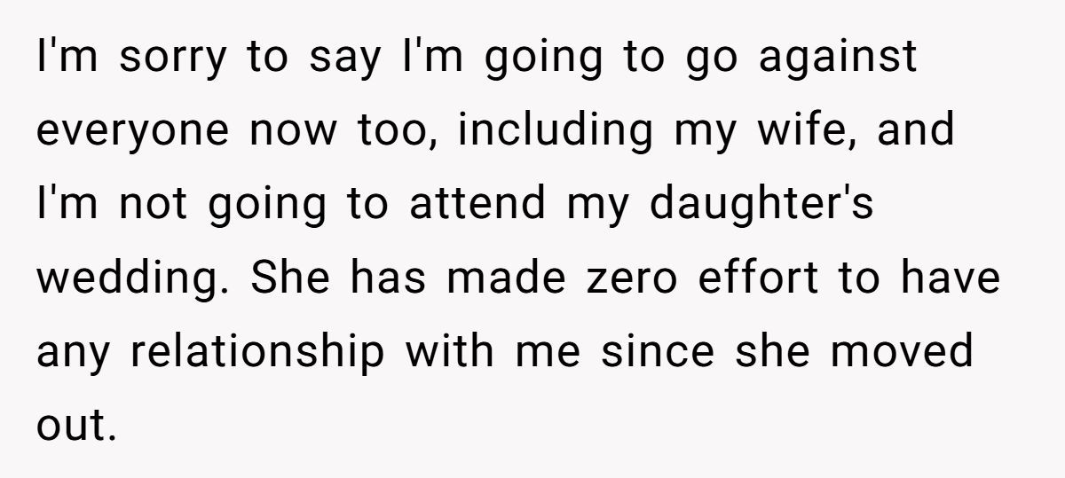 This Redditor’s refusal to attend his daughter’s wedding after she excluded his wife and kids, while inviting her mom’s family, sparked tears and accusations of being an a**hole. Reddit mostly backs his stand for fairness, but her divorce-driven resentment complicates the rift.