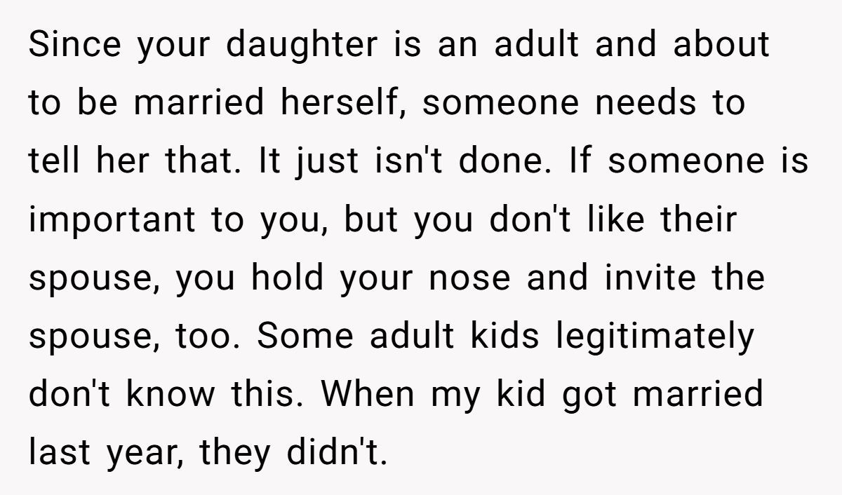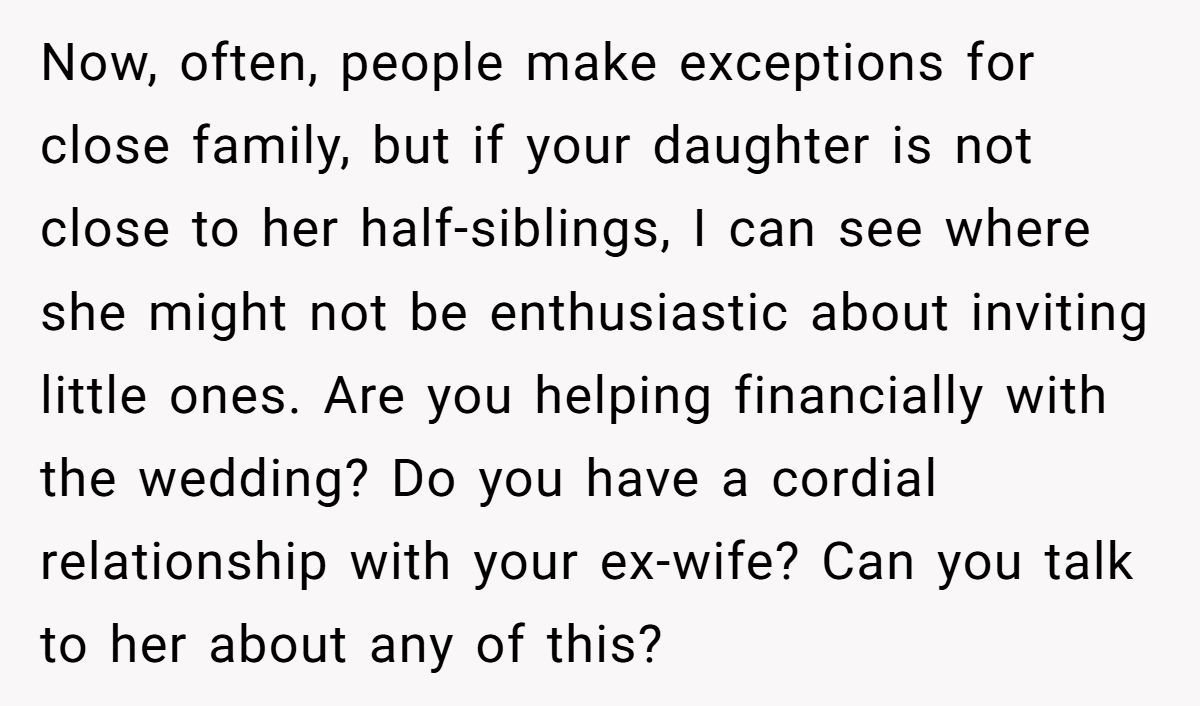 Then there’s the walk down the aisle. According to VeryWell Family, adult children of divorce often struggle to balance tradition with emotional comfort. They want a biological parent present—but on their terms. In this case, the daughter may not be asking for her dad’s presence as much as his participation, to avoid public questions and uphold appearances.