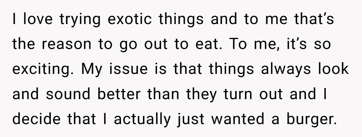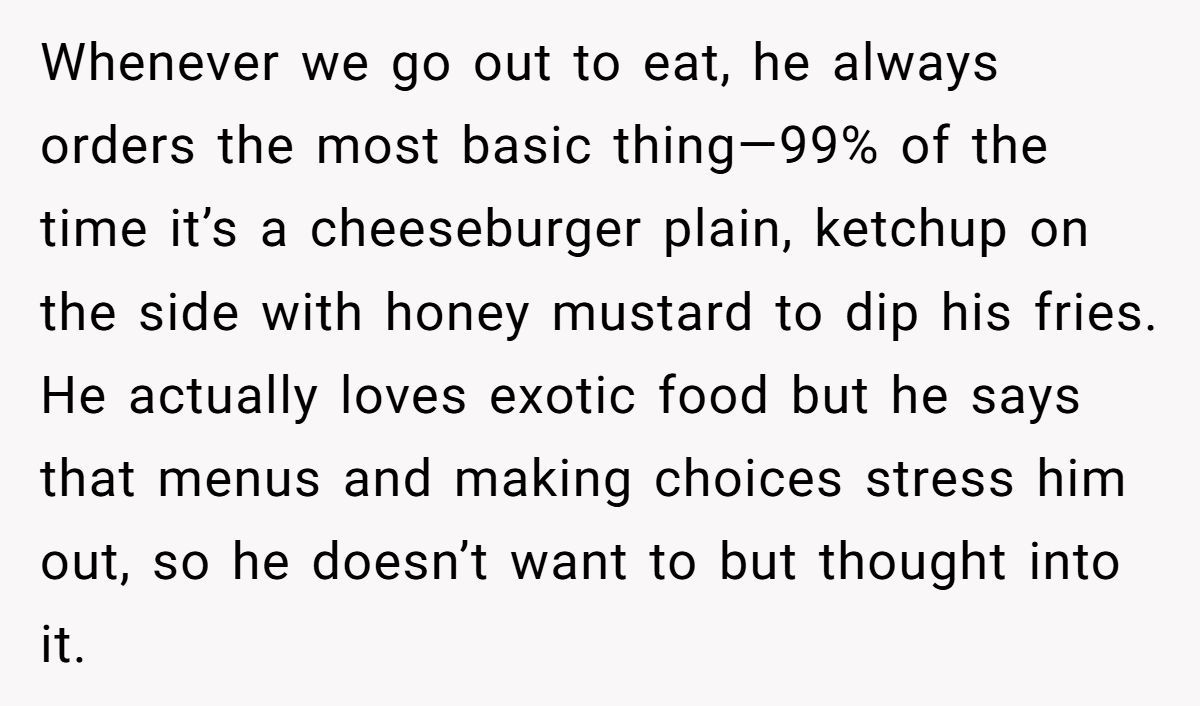 A Redditor walked into a dating dynamic that’s part culinary adventure, part emotional minefield. She’s happily clicking with a longtime friend‑turned‑boyfriend who plays it safe with a plain cheeseburger, ketchup and honey mustard on standby, every. single. time. She loves exotic meals, but often finds herself ordering something she doesn’t really want—then asking him to switch plates. He always obliges. Until he doesn’t.