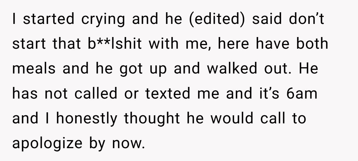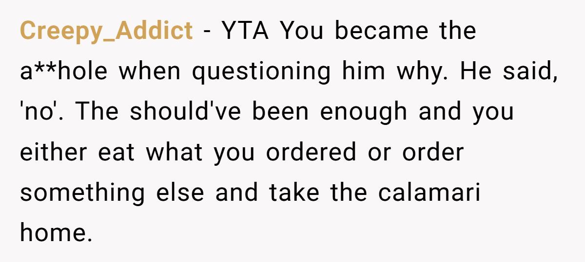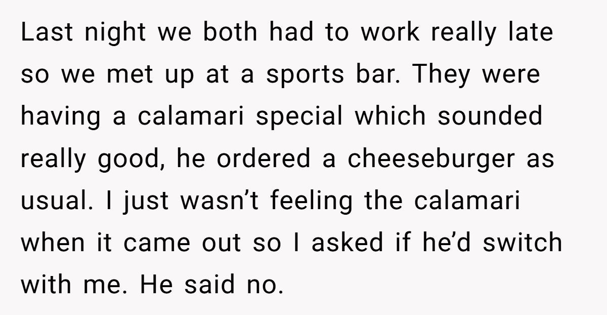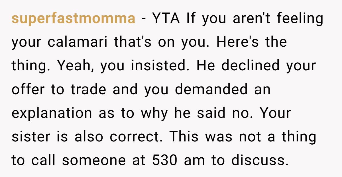 Last night, calamari looked tempting but disappointed. She asked to swap, he refused—and it exploded into a tirade. He accused her of using him as a garbage disposal, then stormed off. She called her sister at 5:30 am. Now she’s wondering: AITA? Want the juicy details? Dive into the original story below!