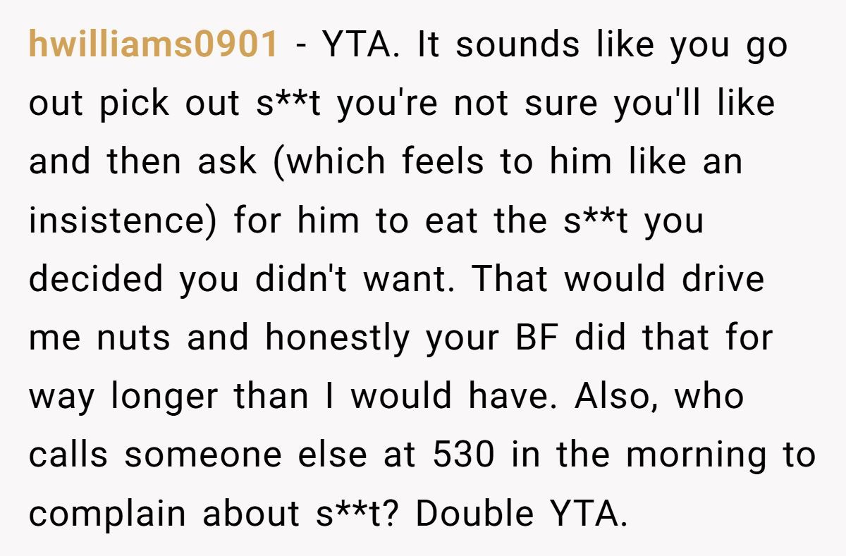 These Redditors slammed OP for treating her boyfriend like a “garbage disposal,” arguing her repeated swaps disrespected his choices