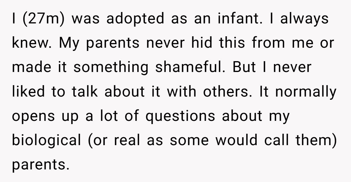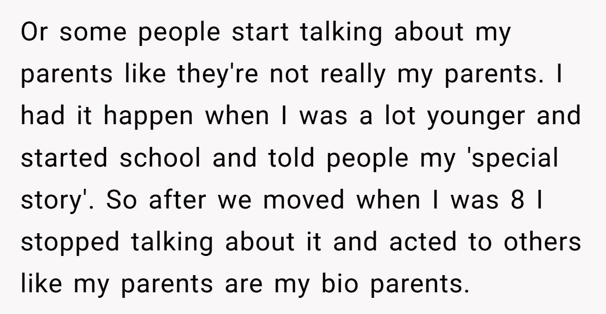 The OP grew up in a secure, open adoptive home. The fact that he knew from the beginning helped create a sense of normalcy—until the outside world began to challenge it. According to a 2021 article by PsychCentral, many adoptees “feel pressure to justify or explain their family dynamic” to satisfy other people’s expectations. It’s exhausting—and sometimes retraumatizing.