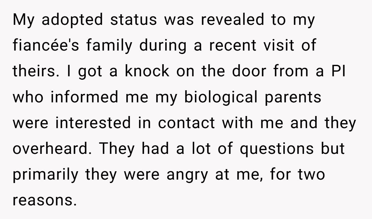 One man shared a story of his fiancée’s family discovering he was adopted when a private investigator arrived to discuss his biological parents’ interest in contact