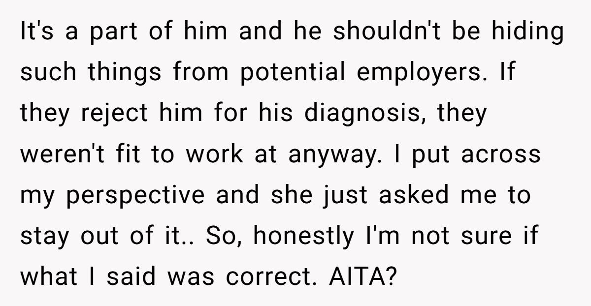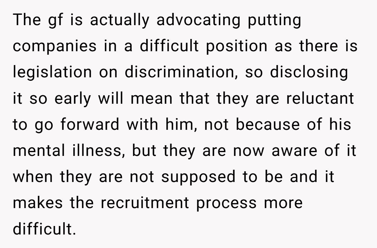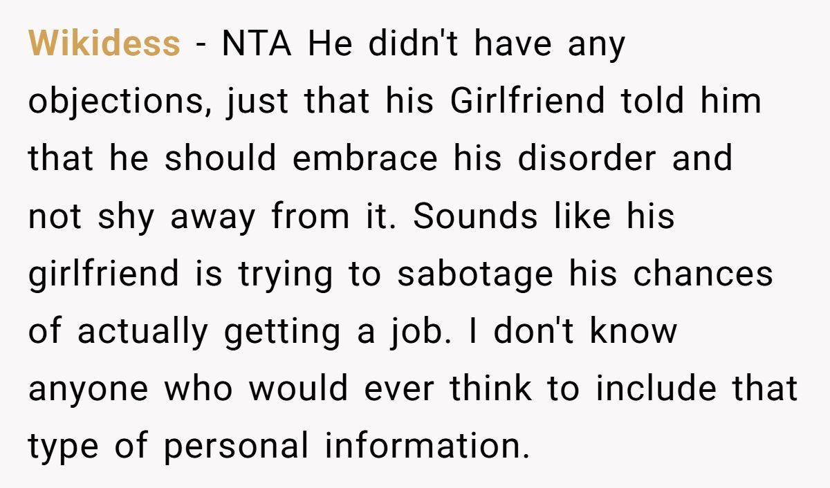 The girlfriend’s view is understandable in spirit. Encouraging someone to embrace their diagnosis and advocate for inclusion is admirable—but inclusion happens best within spaces where trust is already established, not in the hiring funnel where implicit bias can silently work against qualified applicants.