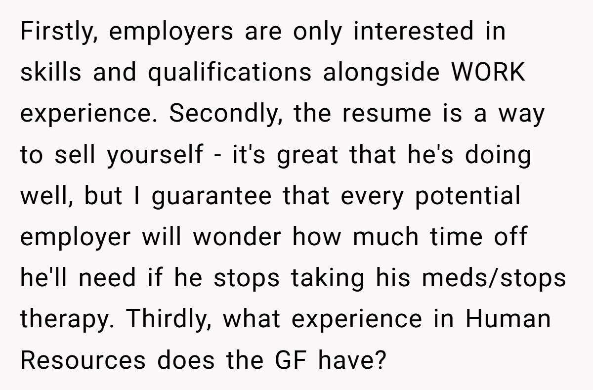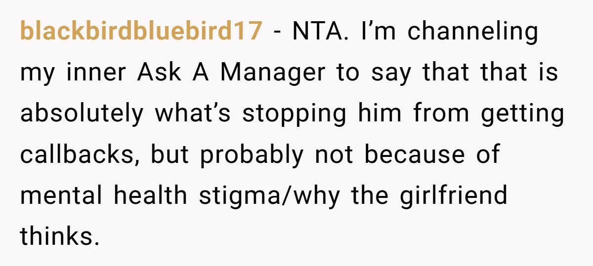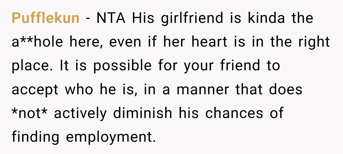 Commenters questioned the girlfriend’s advice, suggesting it could sabotage his job prospects, even if well-intentioned, by ignoring workplace realities
