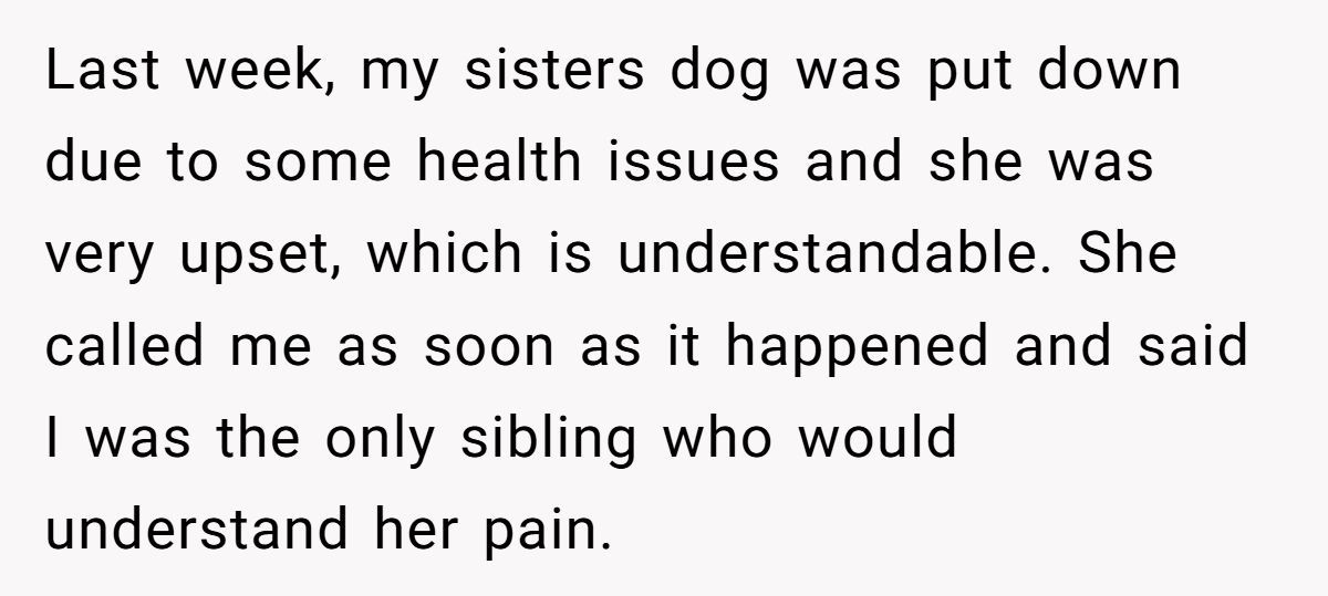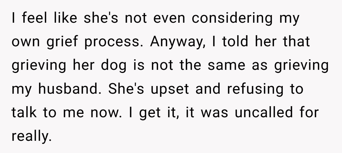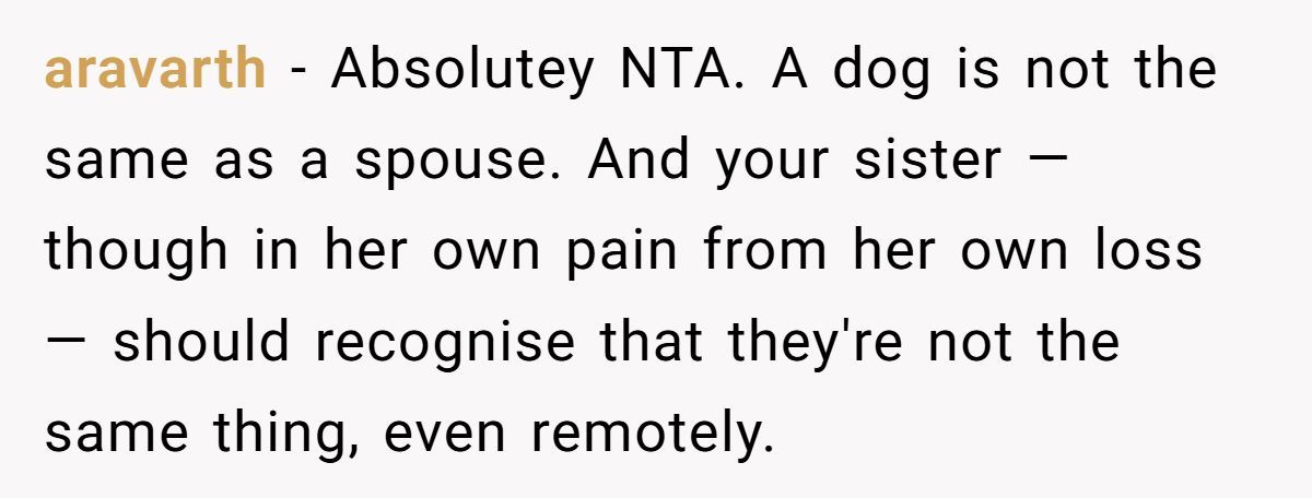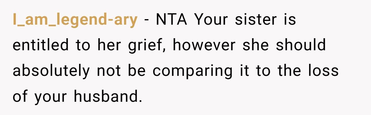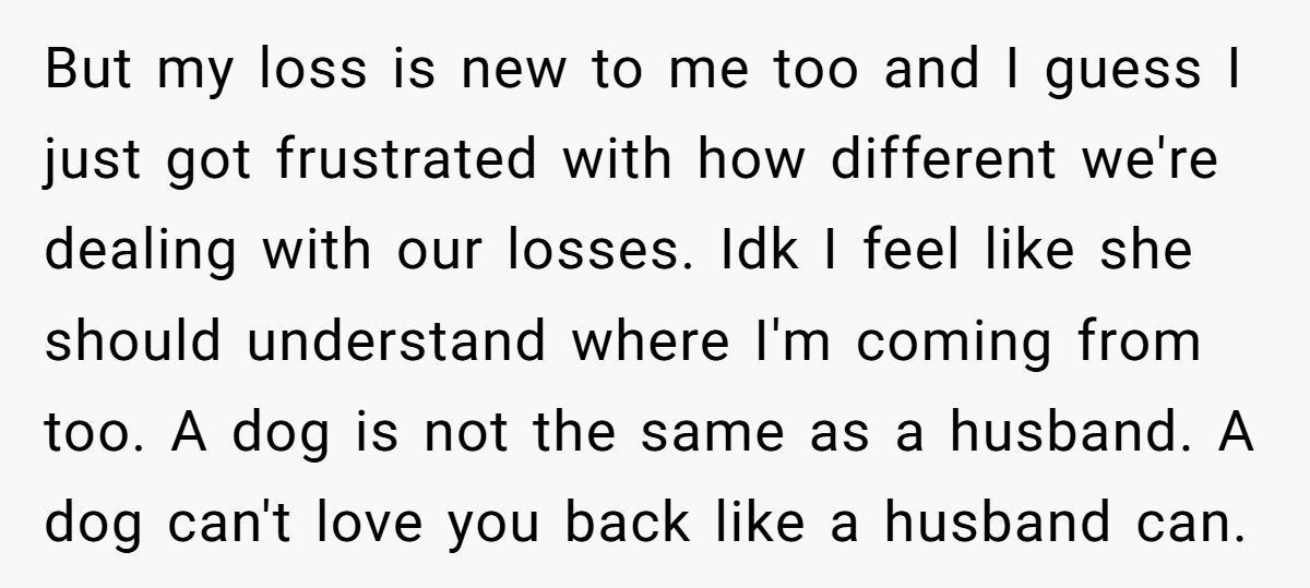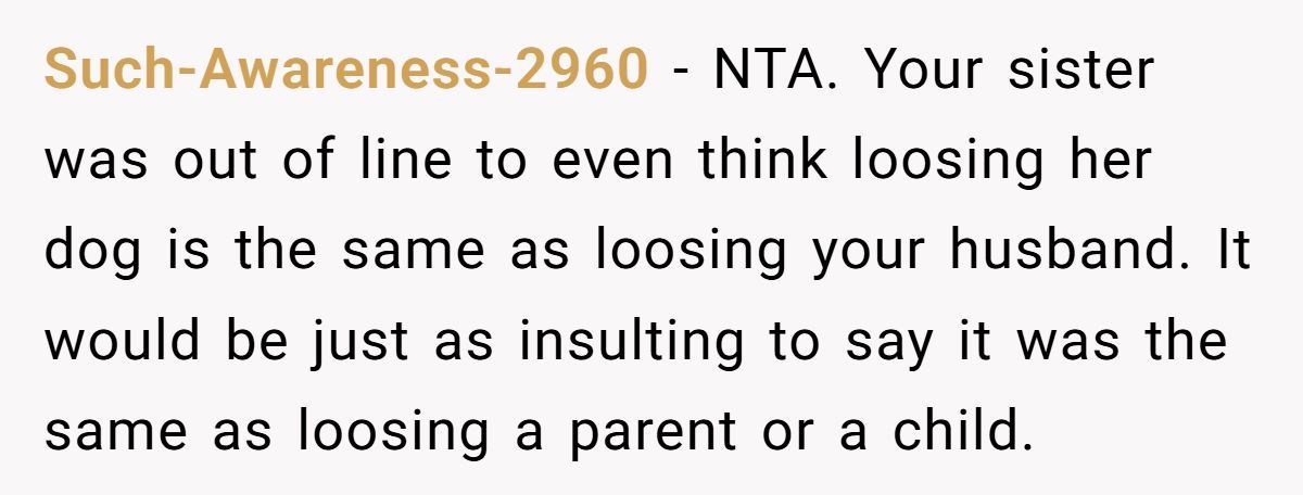 One widow shared a raw story of clashing grief after her sister compared losing her dog to OP’s loss of her husband just a month ago
