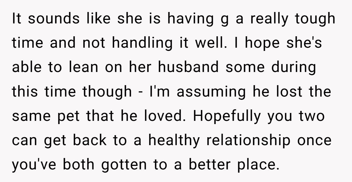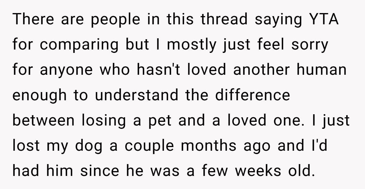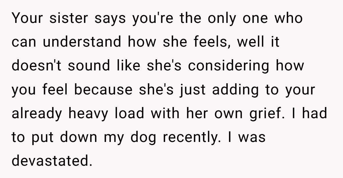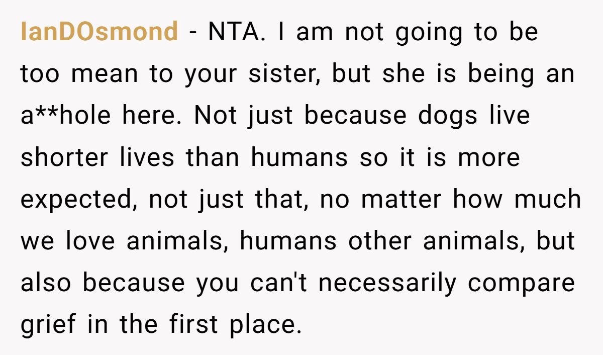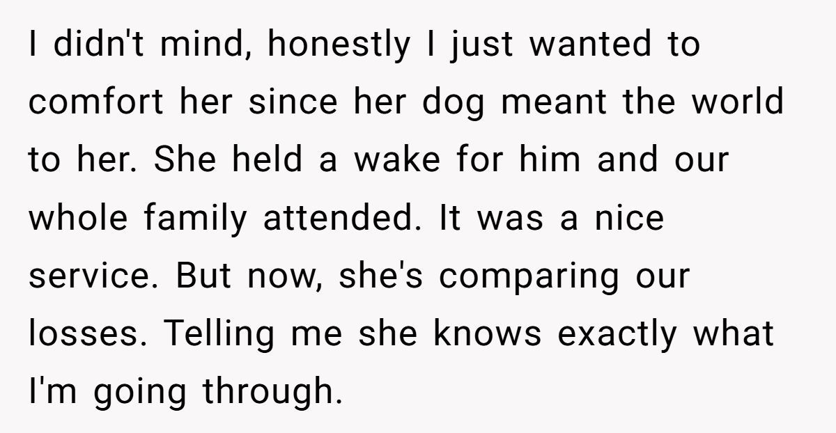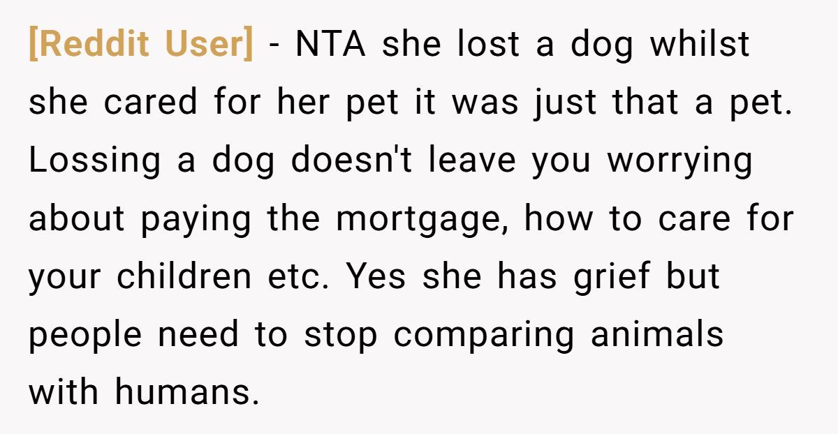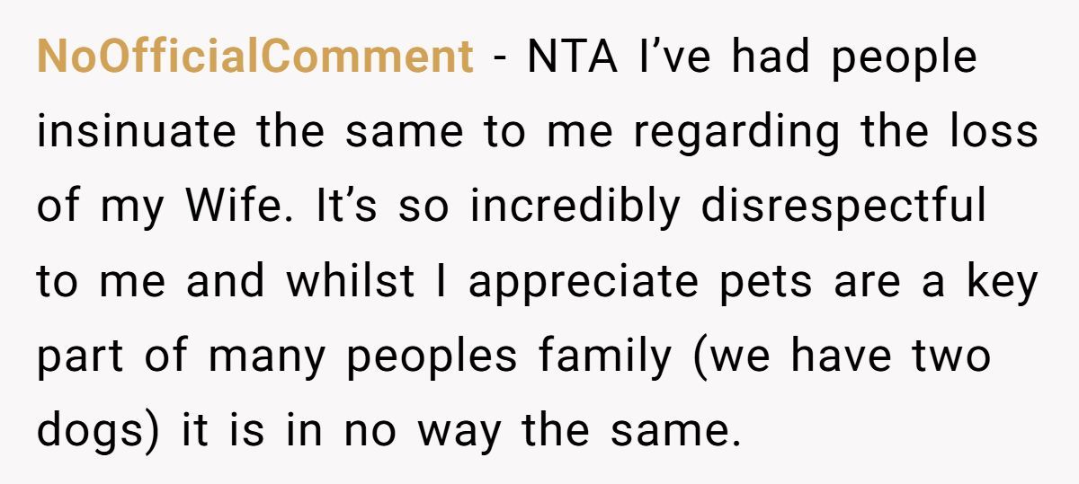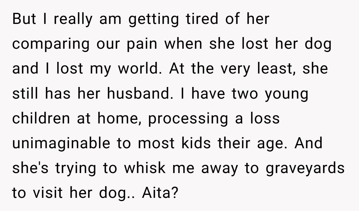 This Redditor, still reeling from her husband’s death a month ago, faced an impossible situation when her sister repeatedly equated her dog’s passing to the loss of a spouse and co-parent. The widow’s outburst—“grieving a dog is not the same as grieving a husband”—was a raw expression of her pain, intensified by her sister’s insistence on shared graveyard visits and her role as a single mom to two young kids. While her words stung, they came from a place of being overwhelmed, not malice.