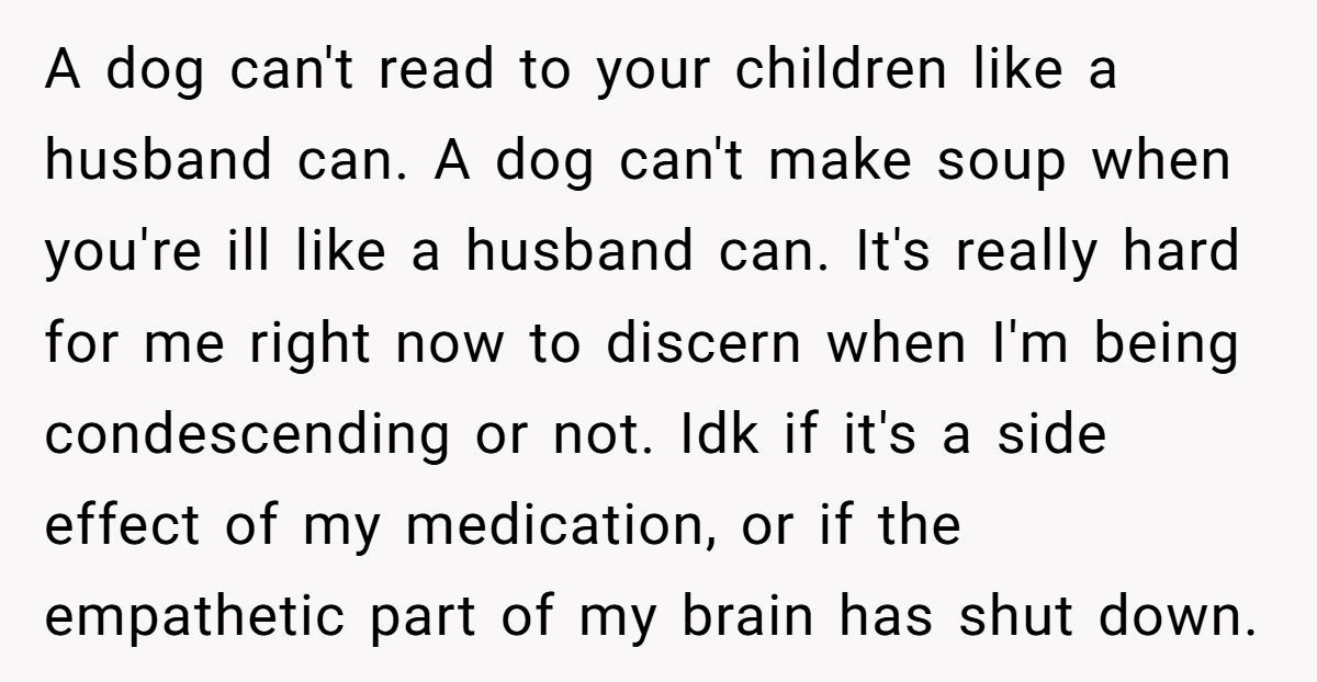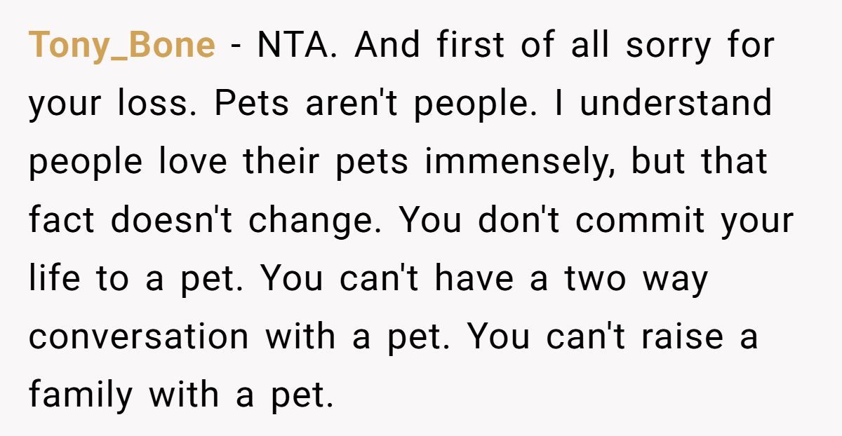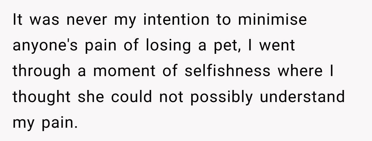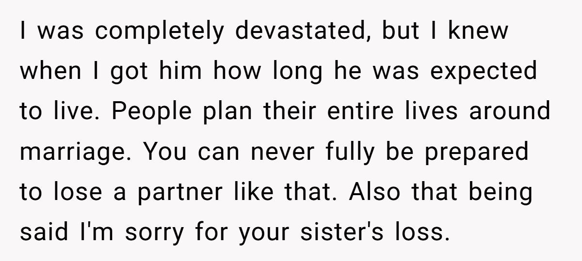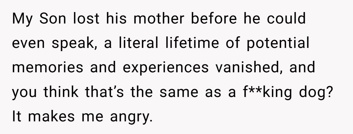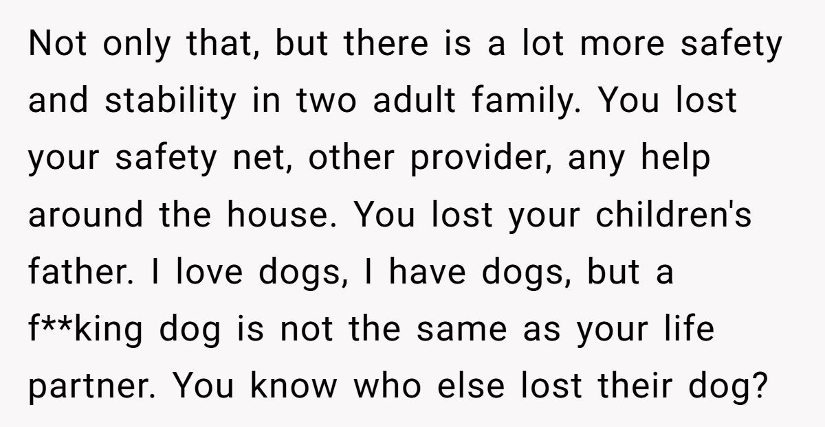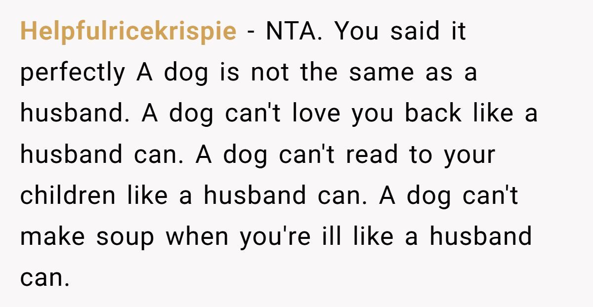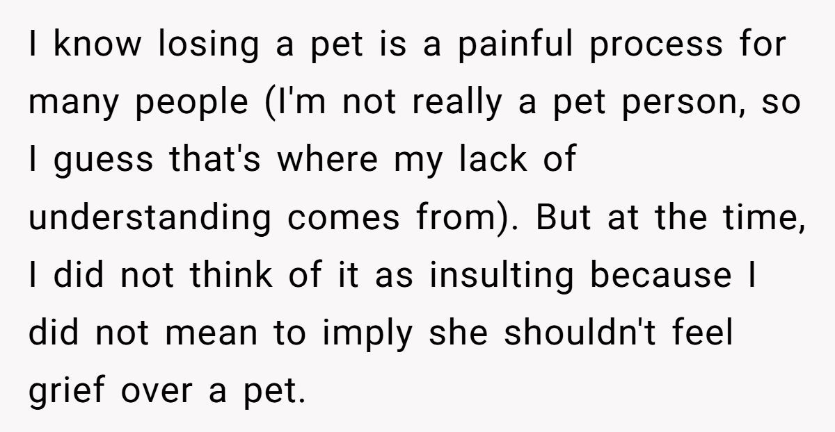 This Redditor, still reeling from her husband’s death a month ago, faced an impossible situation when her sister repeatedly equated her dog’s passing to the loss of a spouse and co-parent. The widow’s outburst—“grieving a dog is not the same as grieving a husband”—was a raw expression of her pain, intensified by her sister’s insistence on shared graveyard visits and her role as a single mom to two young kids. While her words stung, they came from a place of being overwhelmed, not malice.