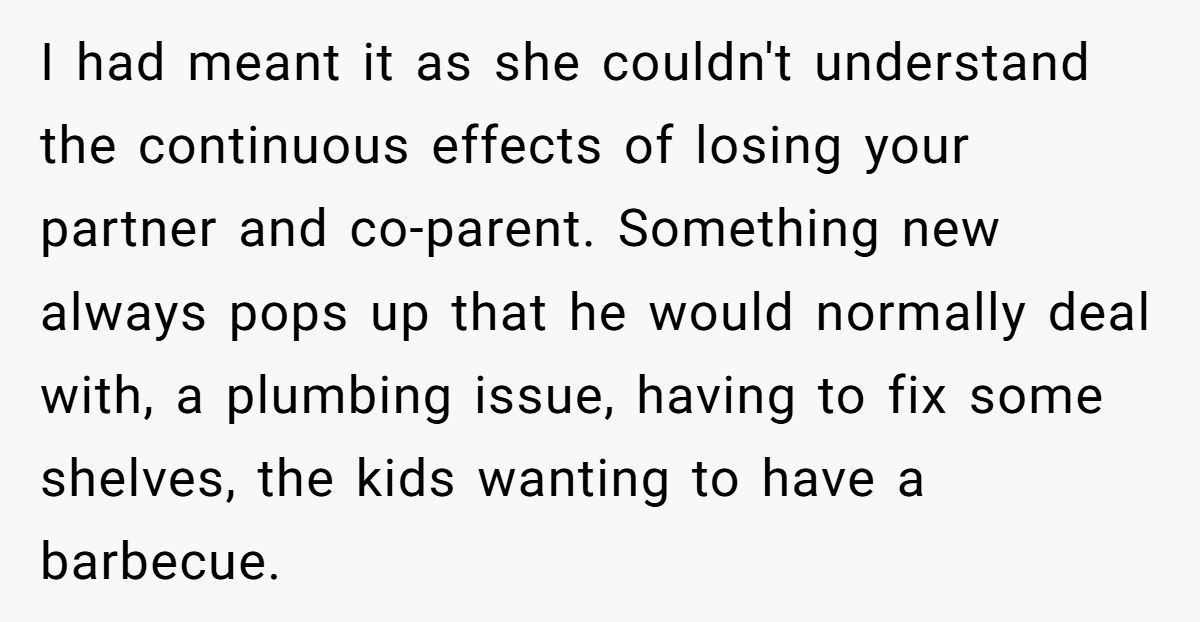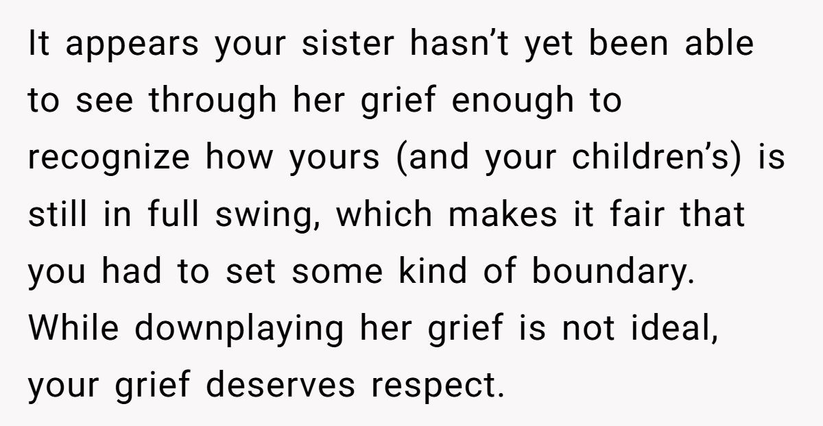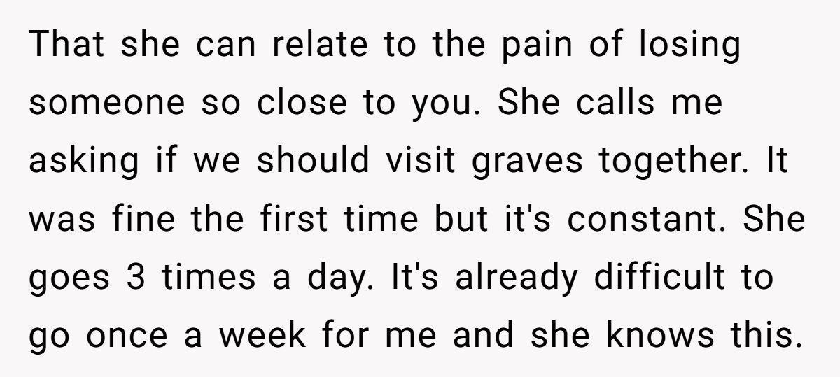 Grief is deeply personal and incomparable. A 2023 study in Death Studies found that comparing losses, even unintentionally, can invalidate a person’s grief, increasing emotional distress by 35%. The sister’s attempt to bond over shared pain misfired, ignoring the Redditor’s unique burden—raising kids alone, managing household tasks her husband once handled, and navigating fresh grief. Her frequent graveyard visits and calls suggest she’s seeking connection, but her approach dismisses the Redditor’s boundaries and different grieving process.