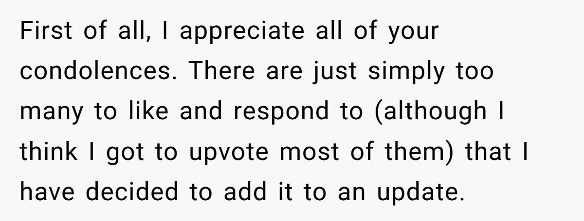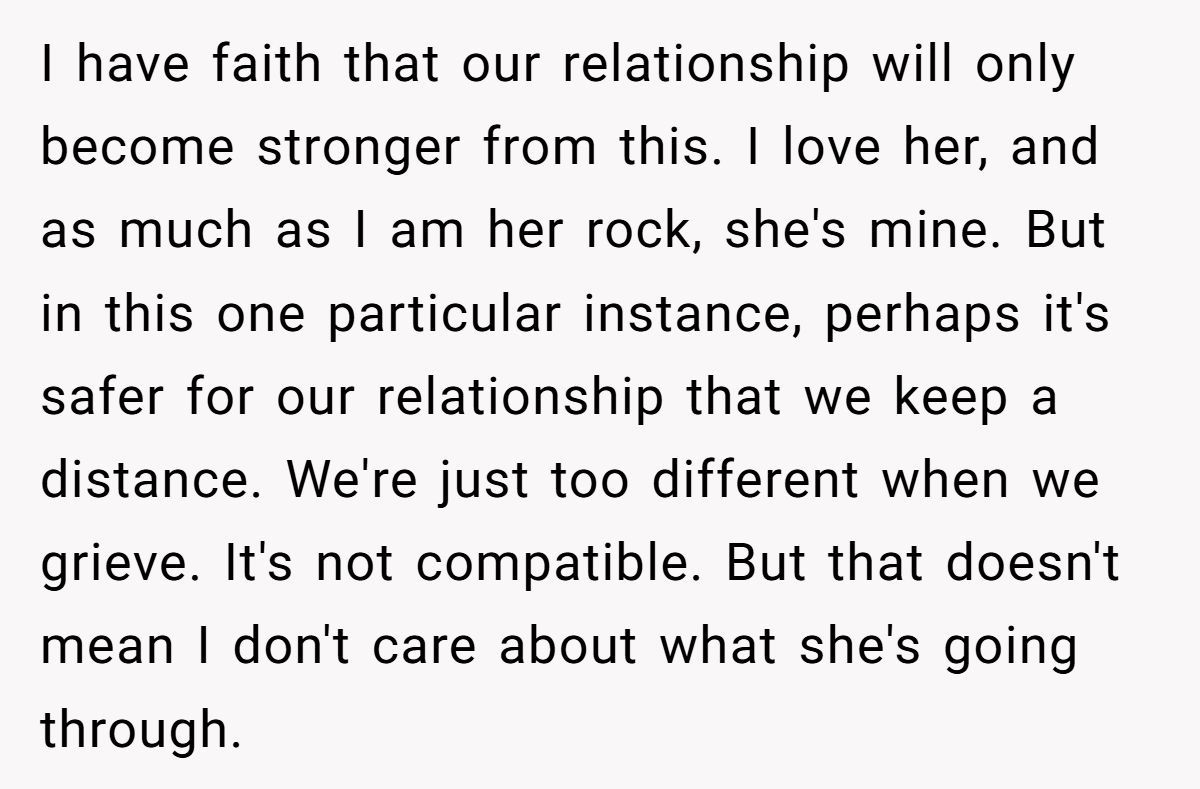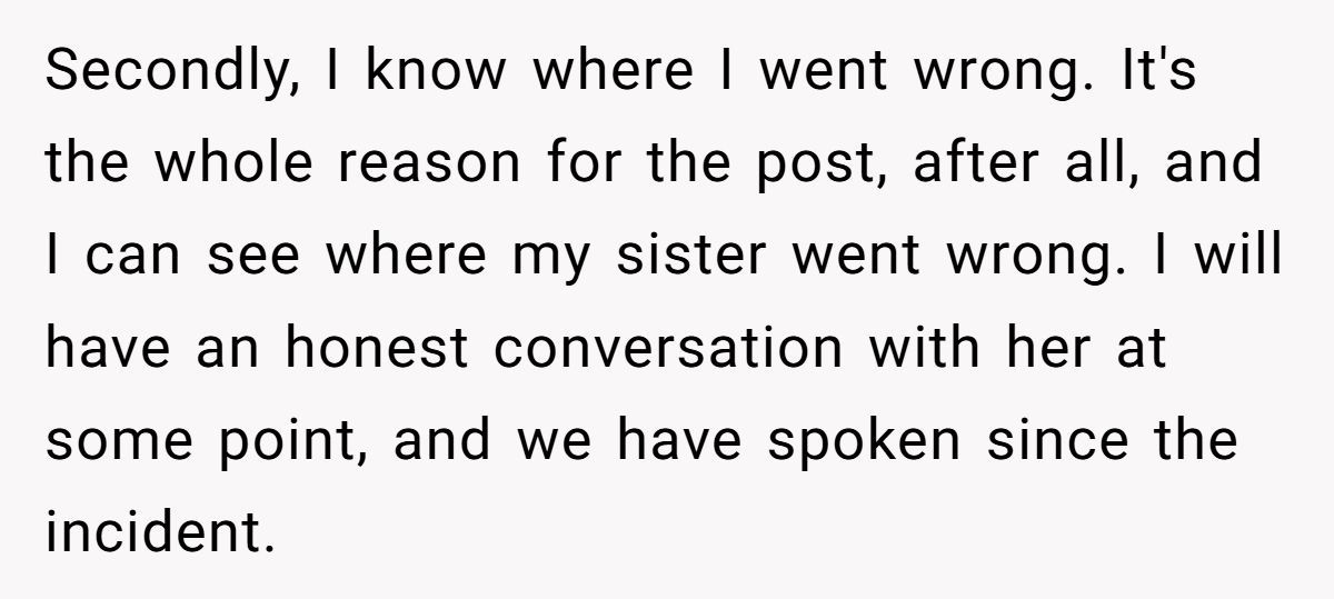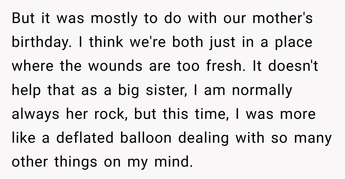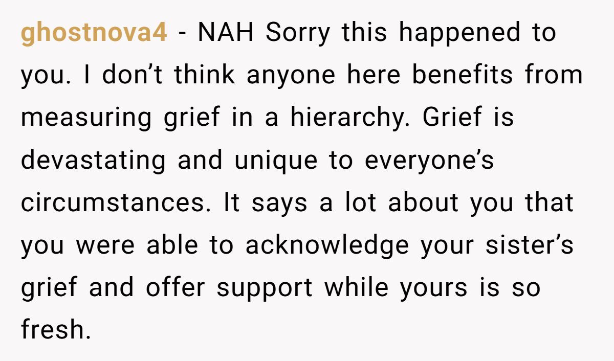 Dr. Alan Wolfelt, a grief counselor, notes, “Grief comparisons alienate mourners; acknowledging each loss’s uniqueness fosters healing”. The Redditor’s update, planning an honest talk with her sister, is a step toward mutual understanding, recognizing both their missteps. The sister’s reliance on her as a “rock” adds pressure the Redditor can’t bear now, especially with her mental health struggles and parenting demands.