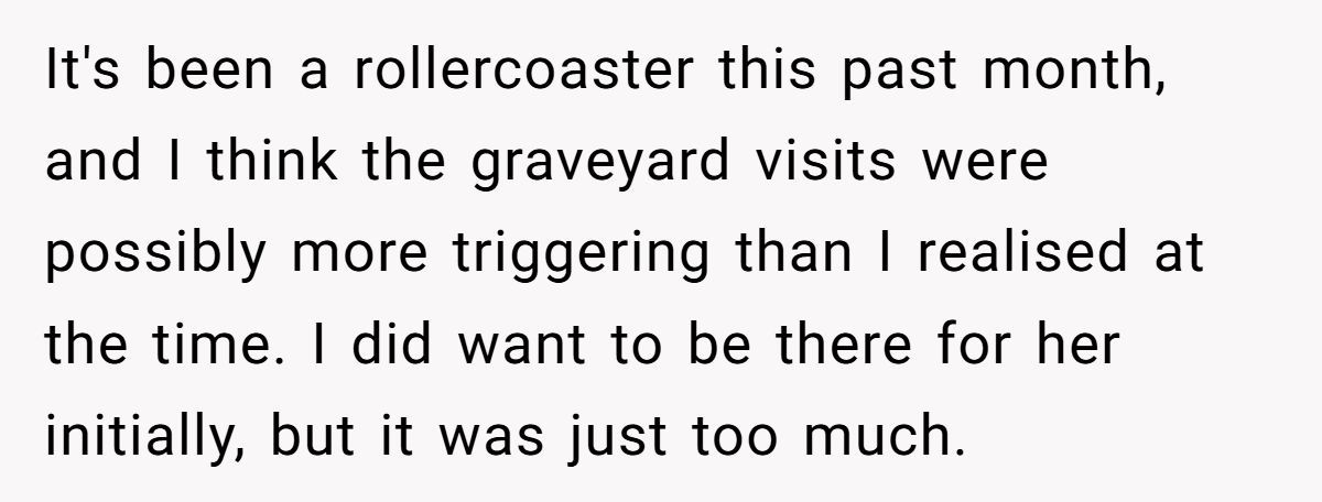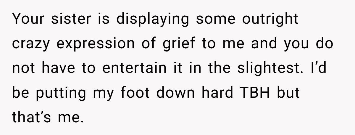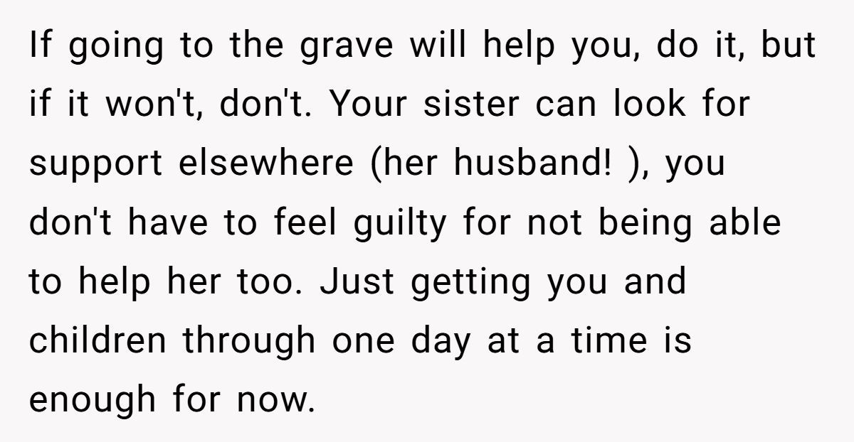 The broader issue is navigating shared family grief without invalidation. The Redditor could set clear boundaries, like limiting graveyard visits or redirecting her sister to her husband for support, while affirming her love but explaining her limits. Therapy might help both sisters process their losses separately. How do you handle someone comparing their grief to yours in a sensitive time?