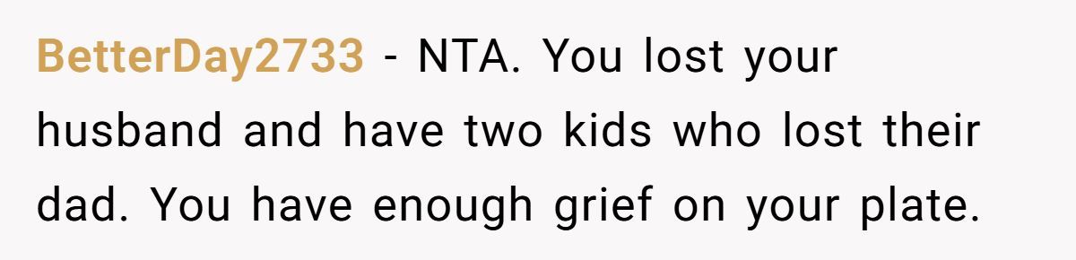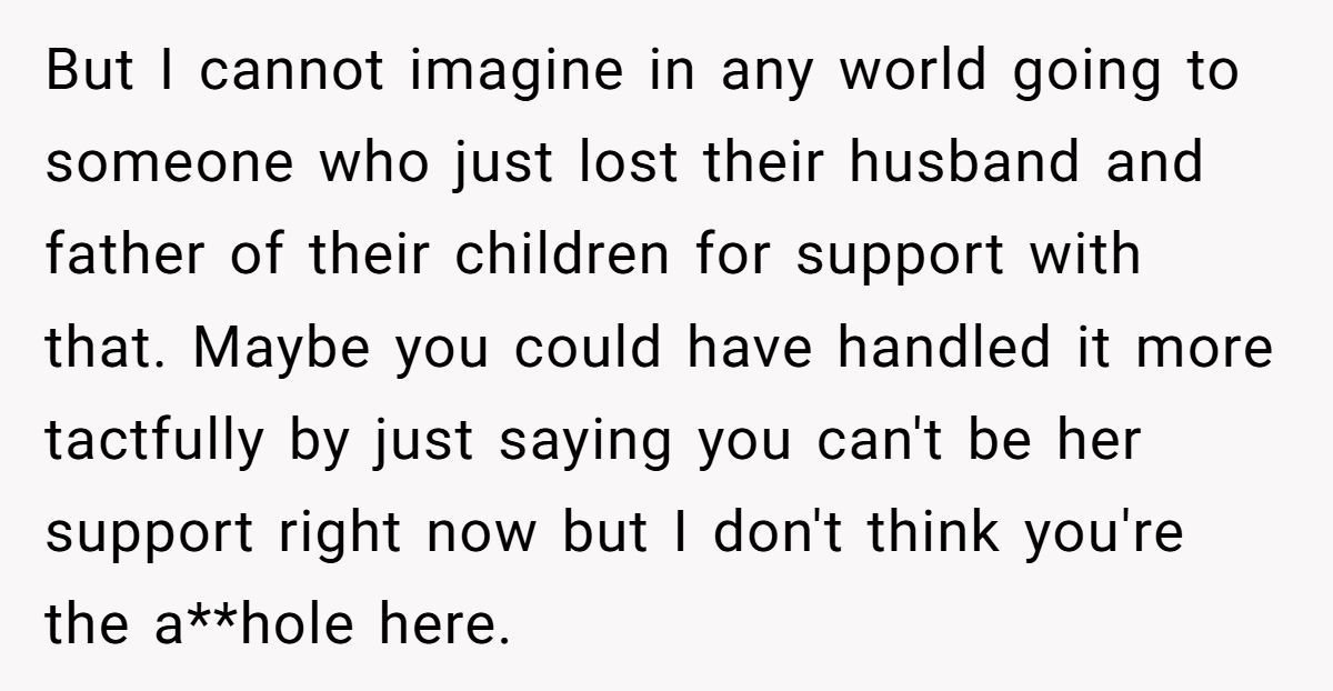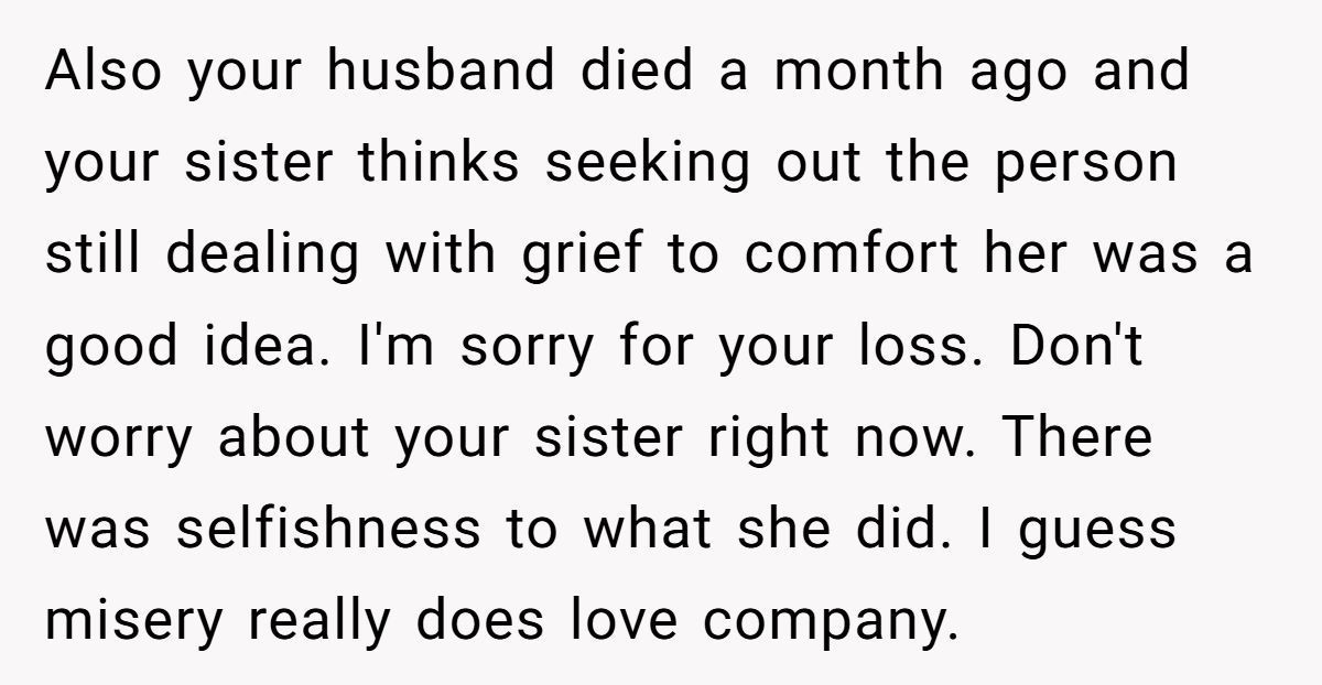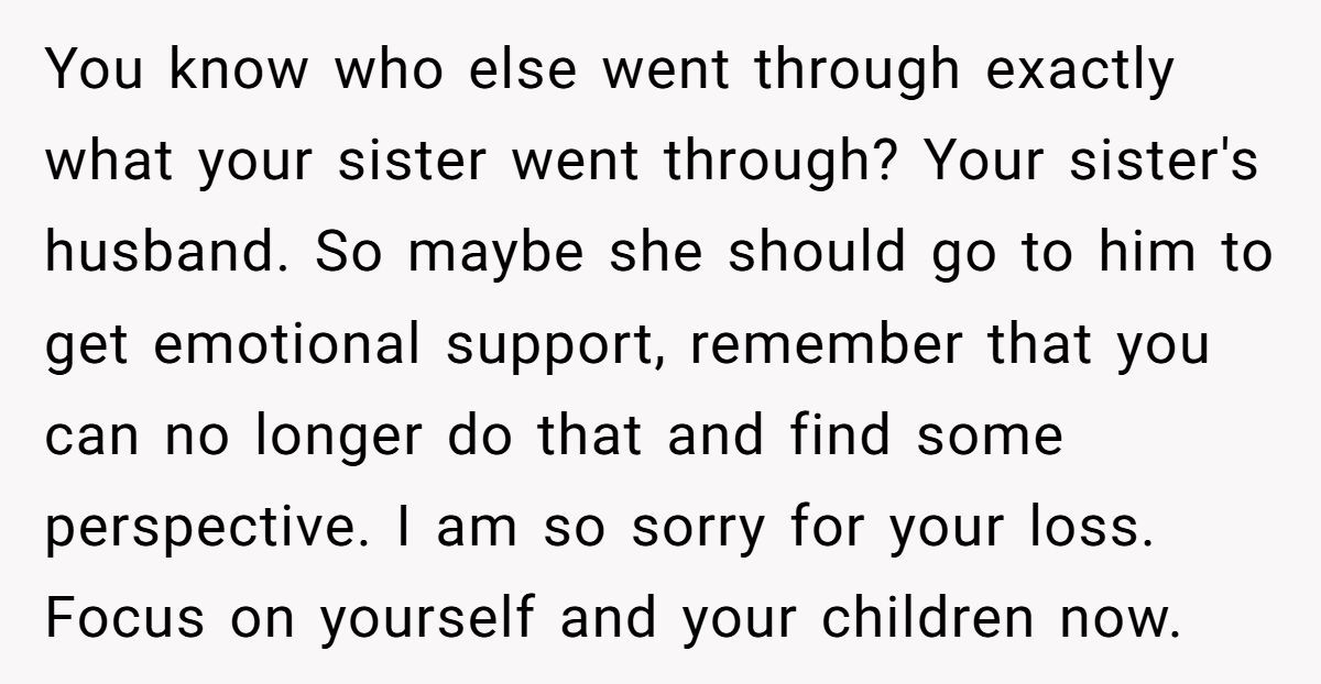 This widow’s honesty may have stung, but sometimes truth is the first step to healing. She didn’t dismiss her sister’s pain—she simply asked not to carry it. With a house full of sorrow and two kids asking questions no mother wants to answer, drawing a boundary wasn’t cruelty. It was survival.