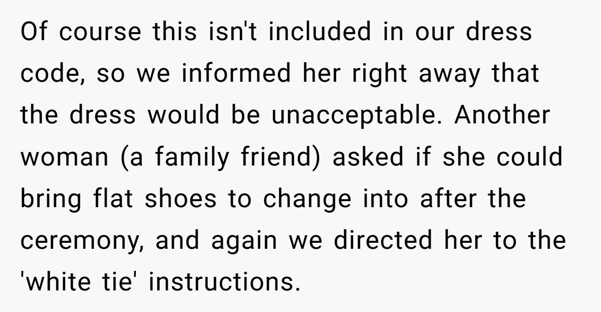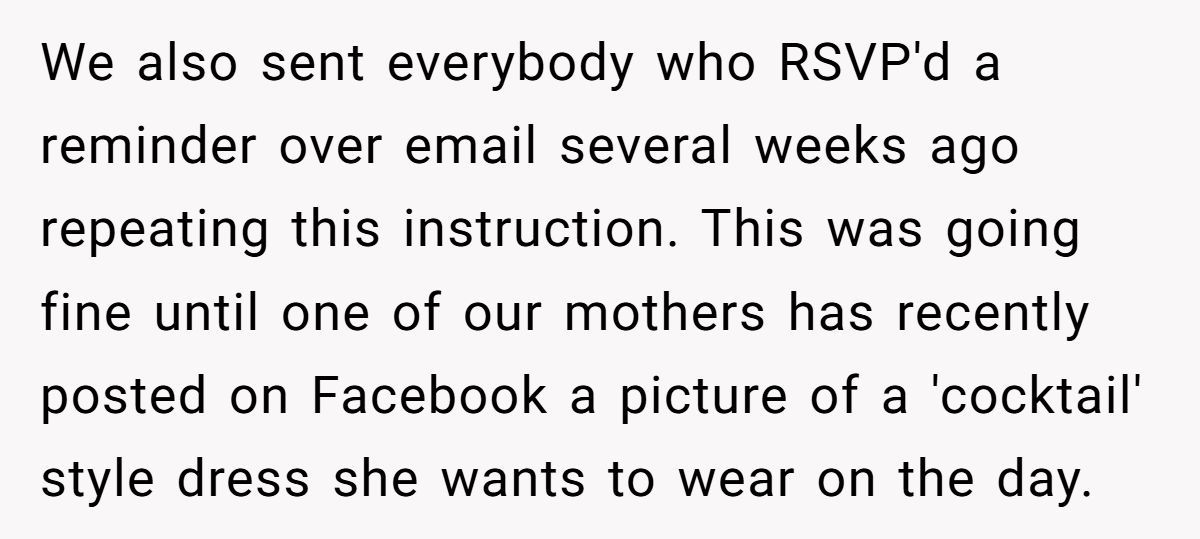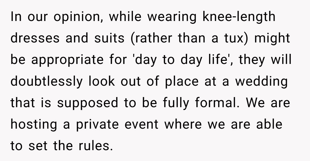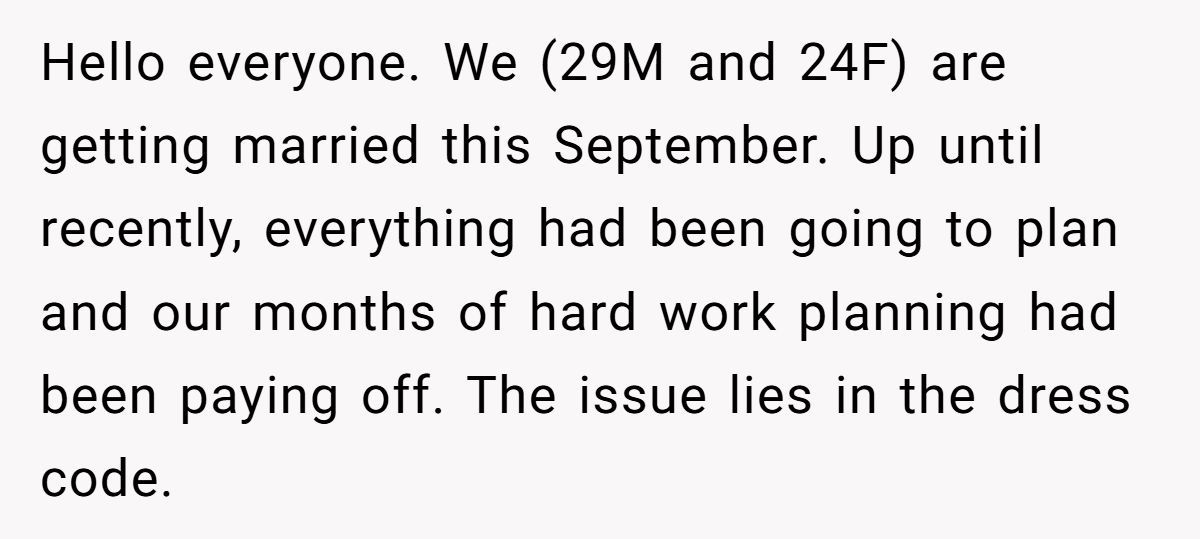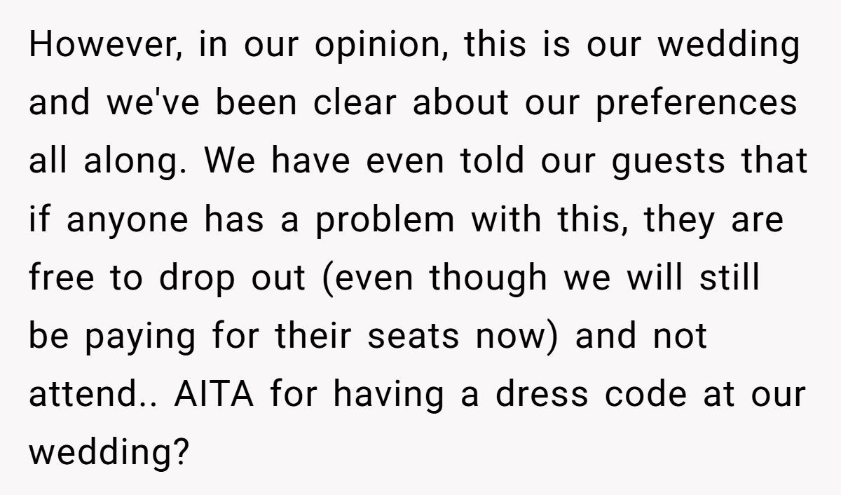 Despite laying out their vision early and reminding guests via email, things spiraled after a family member posted a casual dress choice online. The groom stood firm on the formal rules—but the backlash from friends and family exploded like confetti at the wrong wedding. Now, the couple’s big day is turning into a social standoff. Curious how a dress code sparked this chaos? The full story’s waiting below.