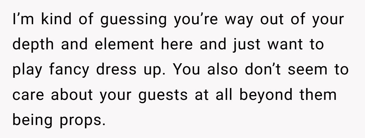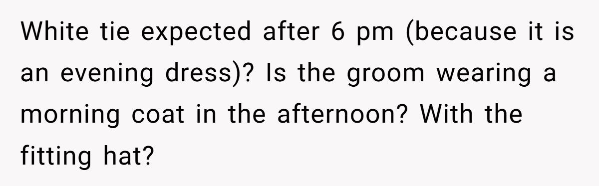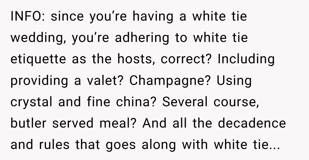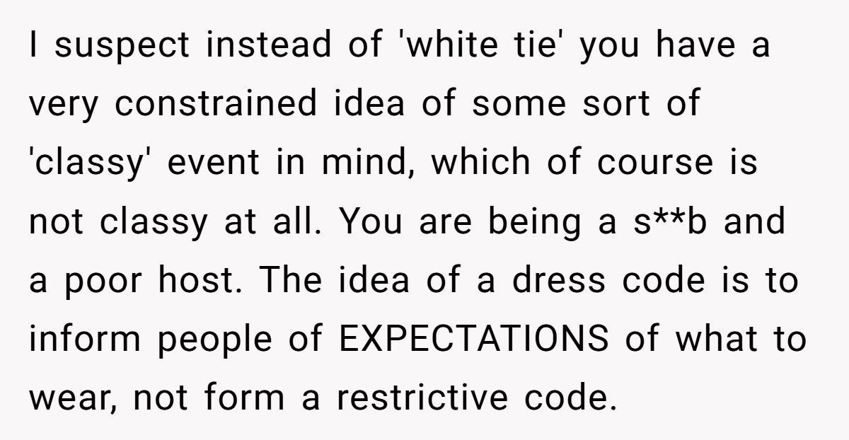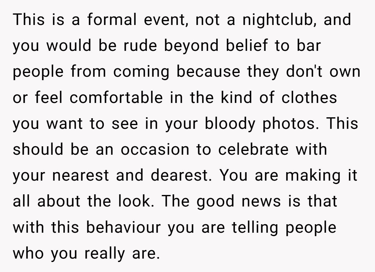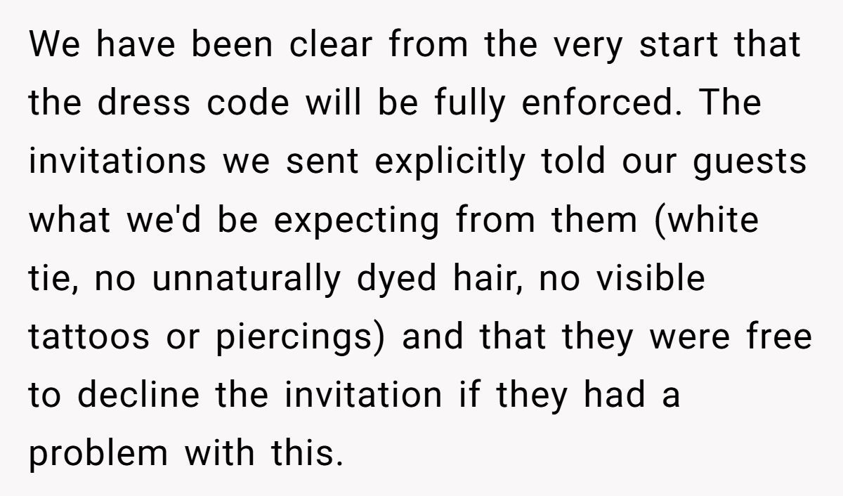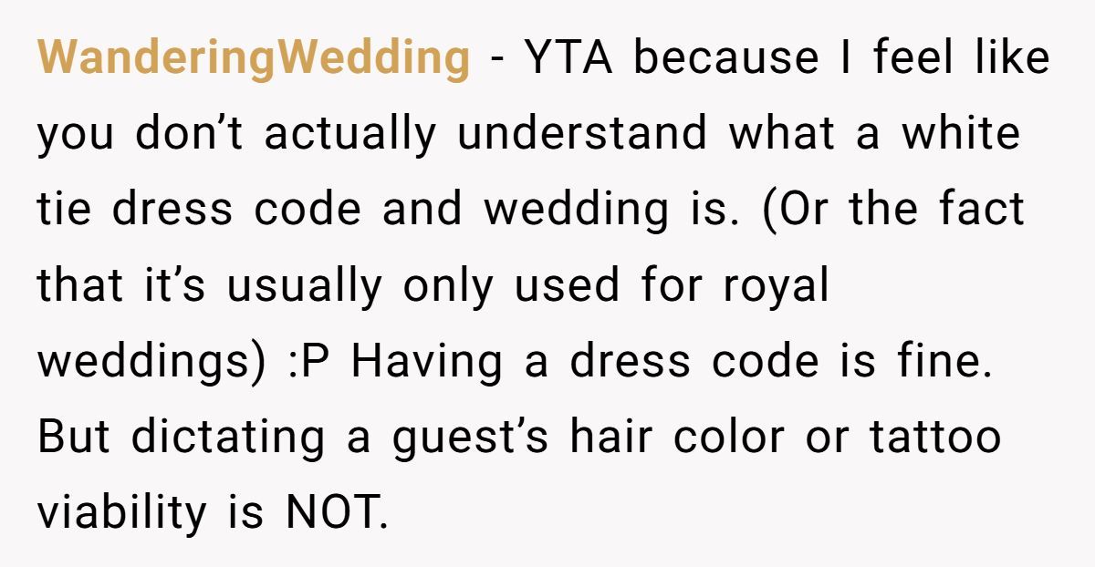 This couple wanted a regal affair: white tie, timeless photos, zero distractions. But when the dress code extended to hair color, body art, and piercings, many guests felt judged before they even picked out shoes. While setting expectations is fair game, micromanaging your loved ones’ appearance can make even the best-dressed event feel cold.