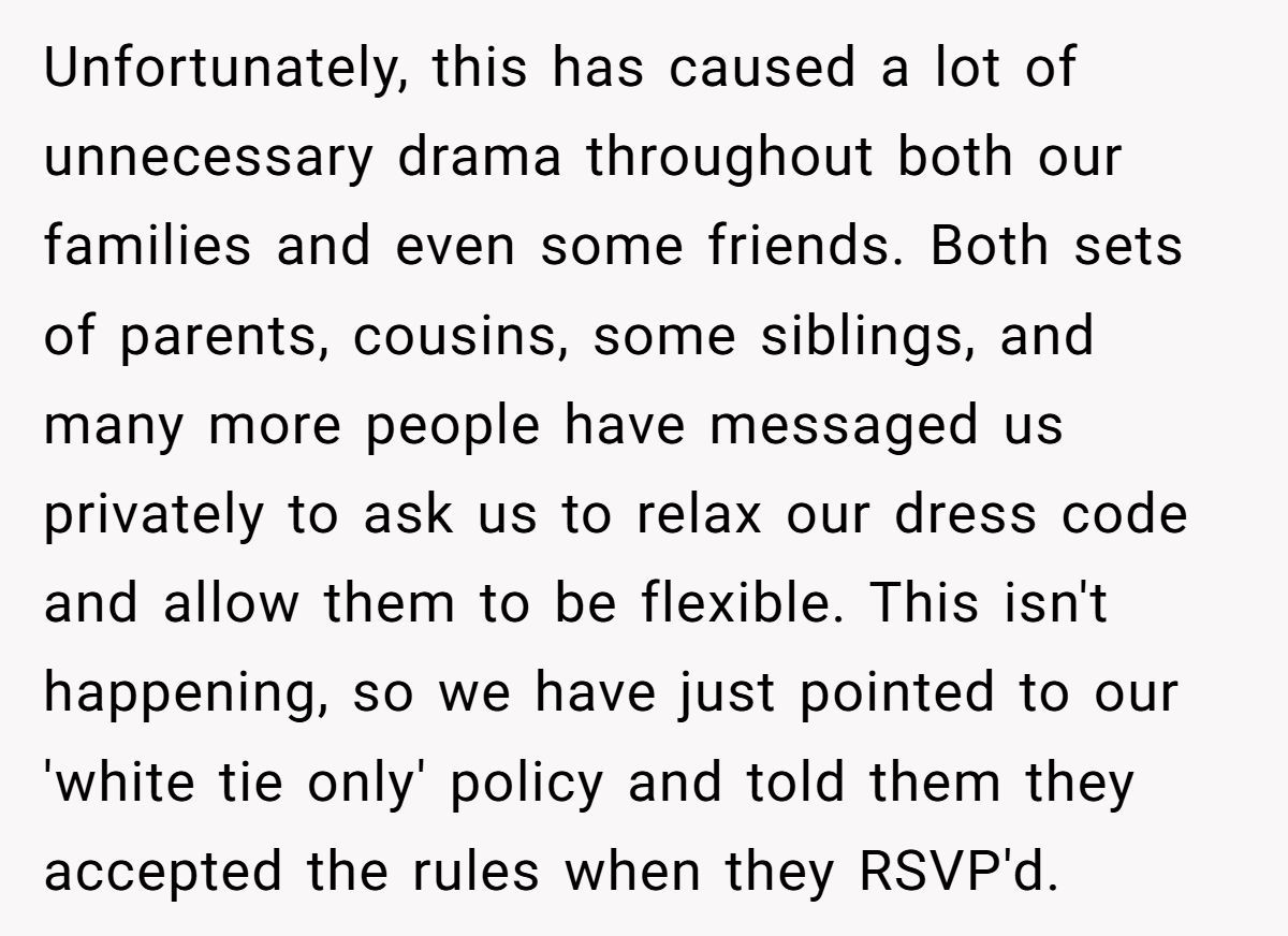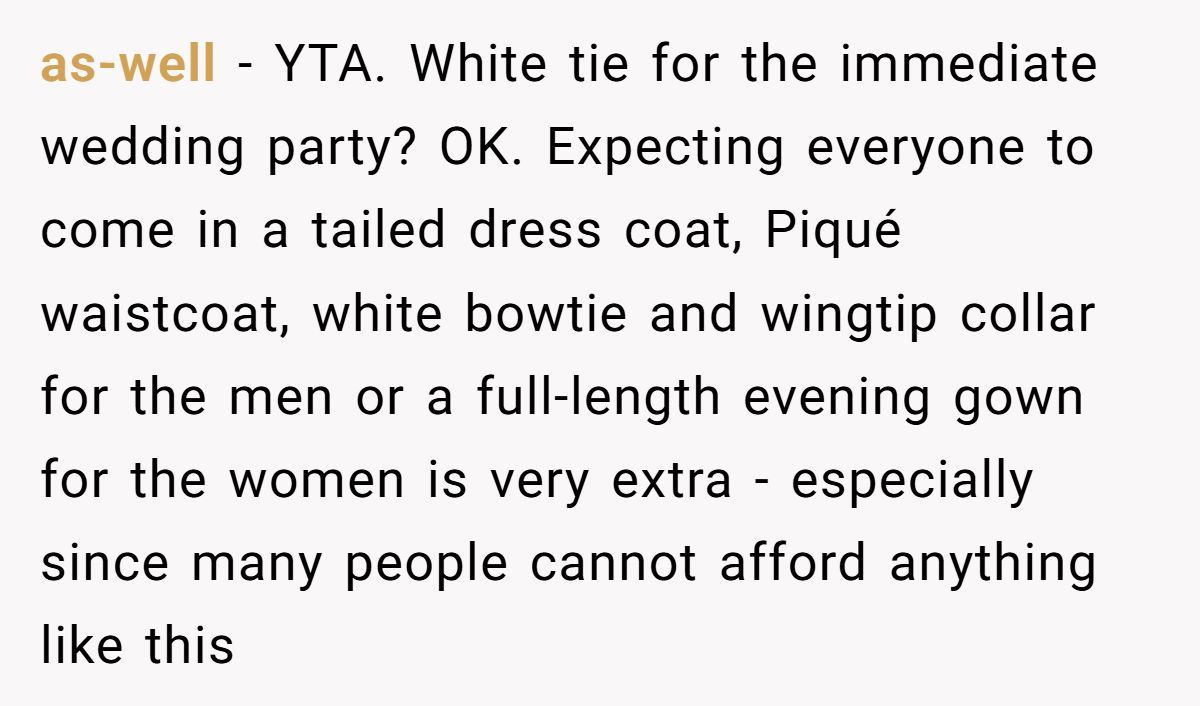 One couple shared on Reddit how their strict white tie dress code for their wedding led to family and friend backlash, leaving them questioning their stance
