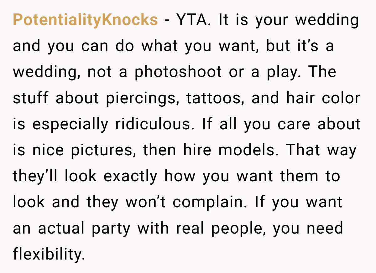 If the couple wants picture-perfect guests, maybe models were the right call. But if they want memories with the people who love them—piercings, rainbow hair, and all—it might be time to loosen the laces just a bit.