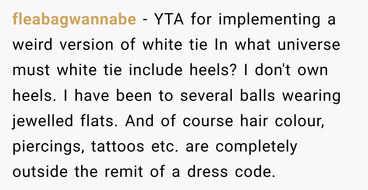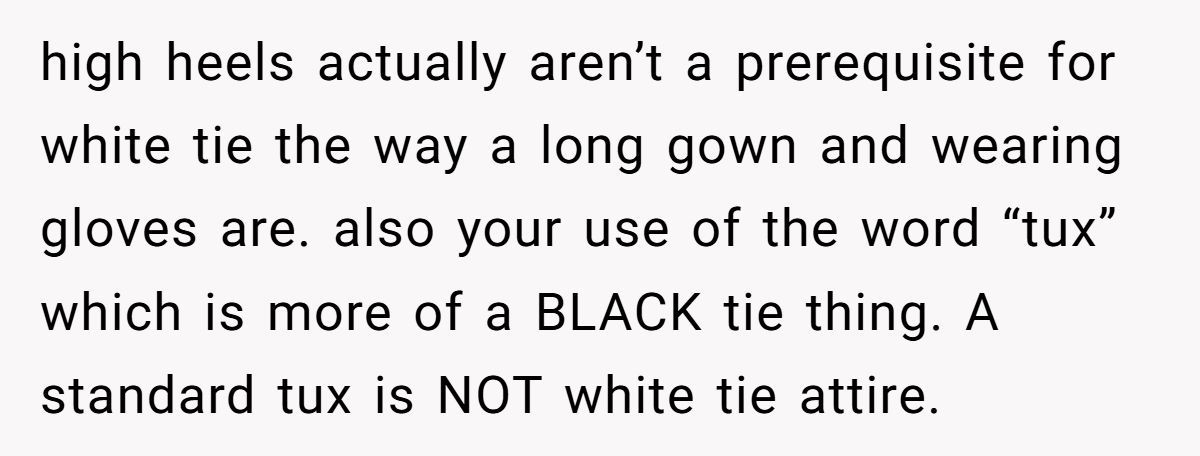 Commenters argued the couple misapplied white tie, which doesn’t cover hair or tattoos, suggesting they’re playing “fancy dress-up” rather than hosting inclusively