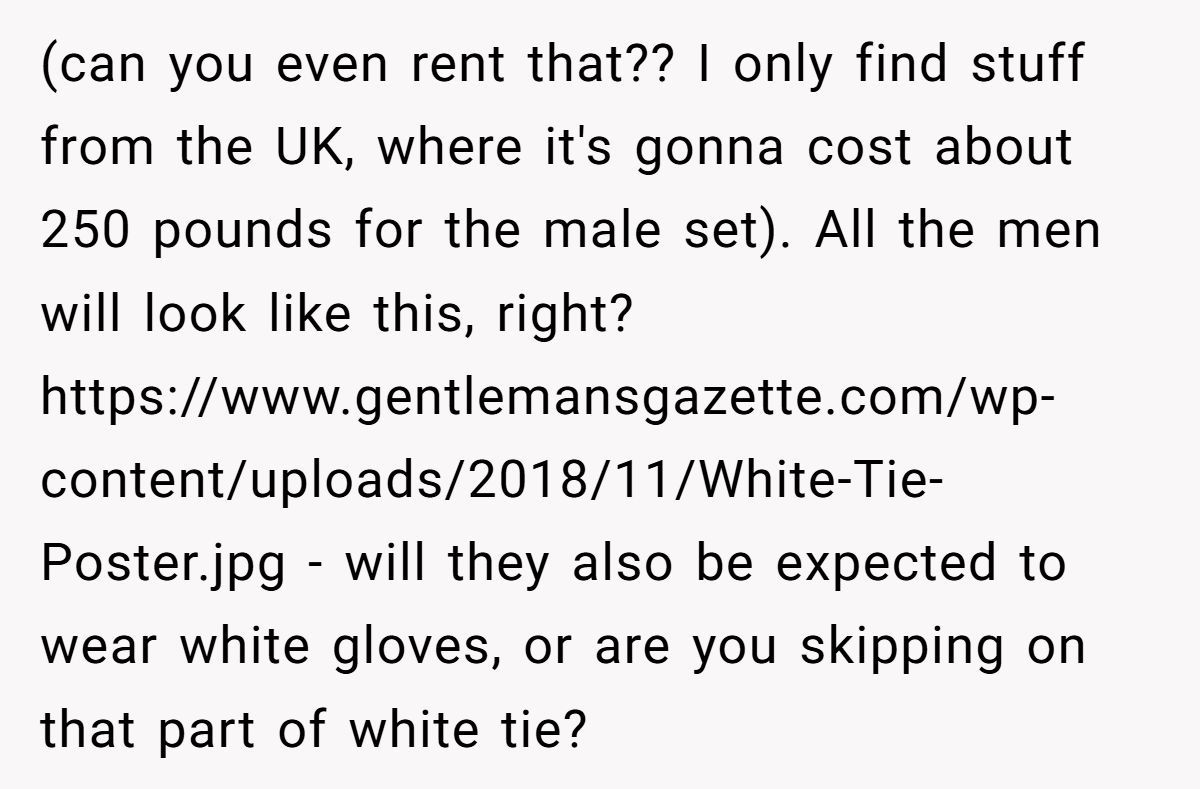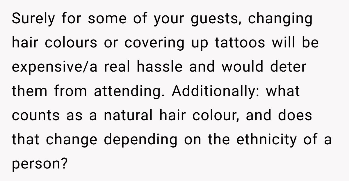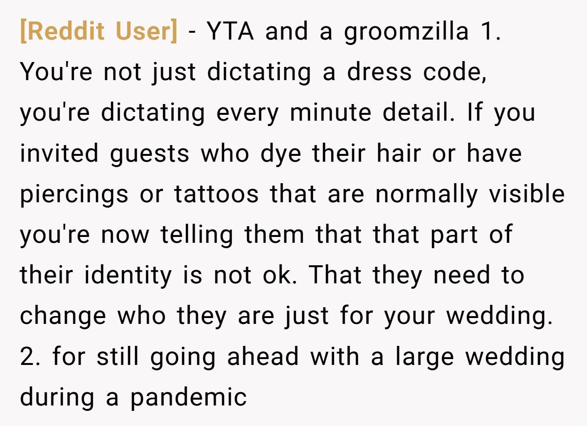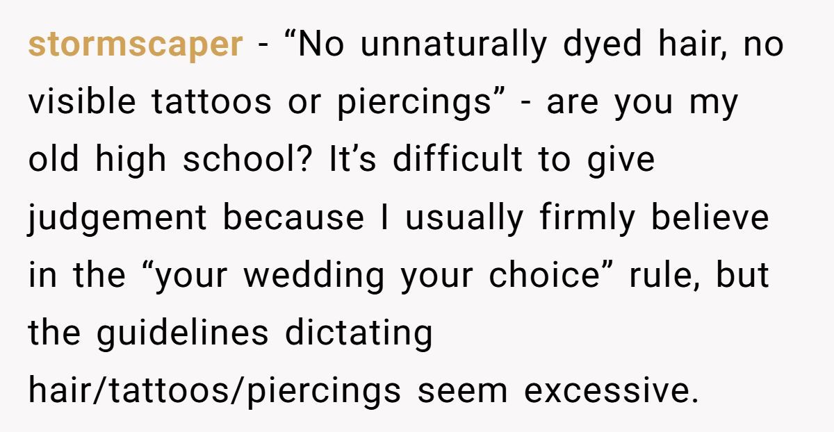The bigger issue here? Control. Asking someone to rent a full white tie ensemble is one thing. Asking them to dye their hair back to a “natural” color or remove meaningful piercings is something else entirely. It suggests that appearances matter more than relationships—which doesn’t exactly scream “celebration of love.”