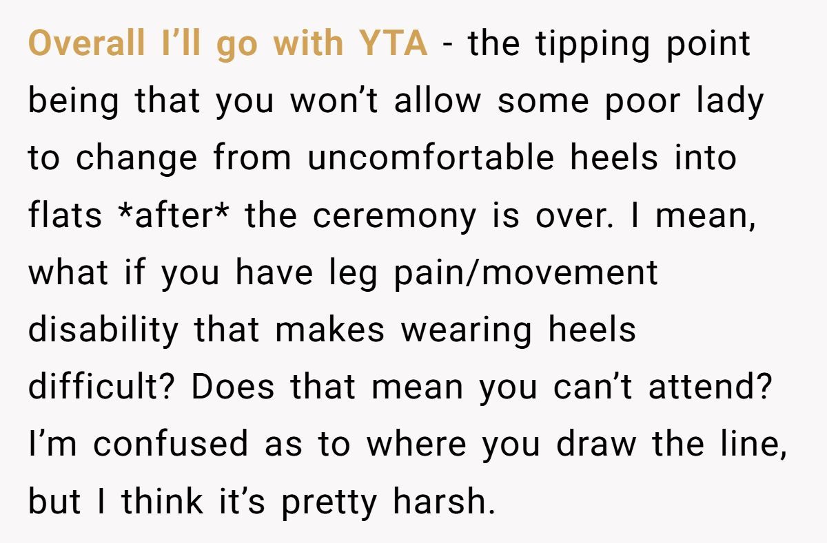 And let’s talk accessibility: high heels, for example, aren’t just a fashion choice. For many people, they’re painful or impossible to wear. Denying flat shoes after the ceremony feels tone-deaf, especially considering medical or mobility needs.