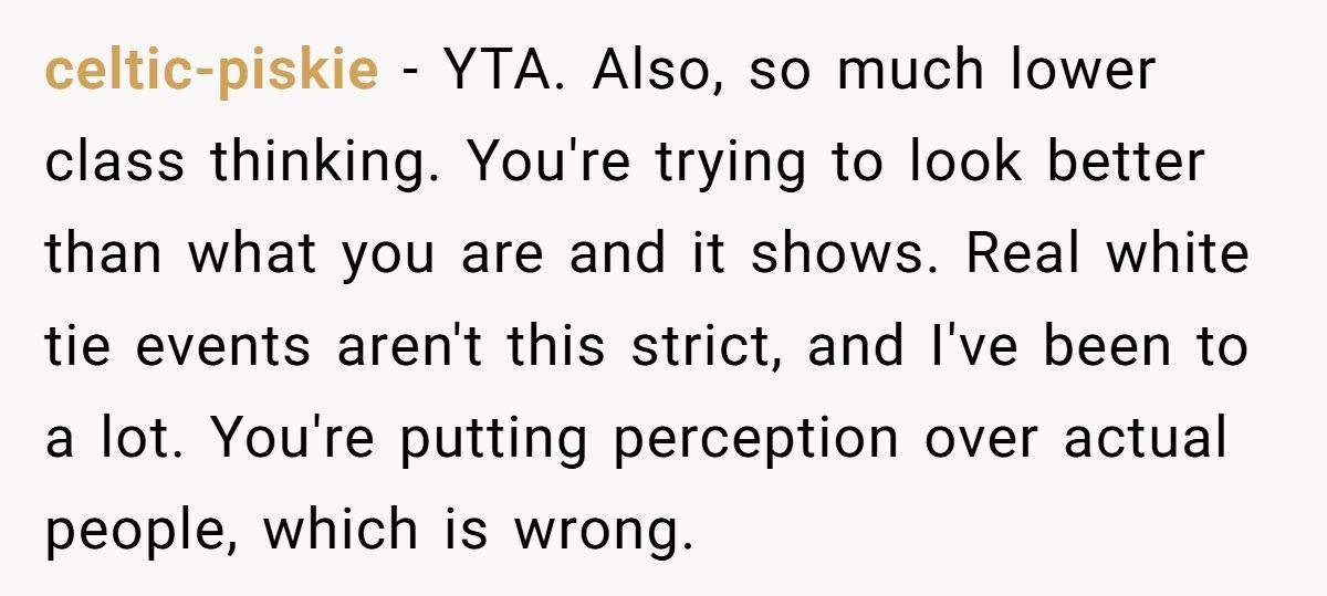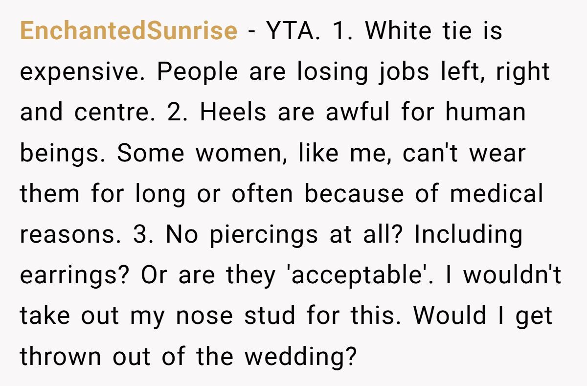 Users highlighted the financial and physical strain of white tie attire, especially for those with mobility issues or job losses, noting it excludes loved ones