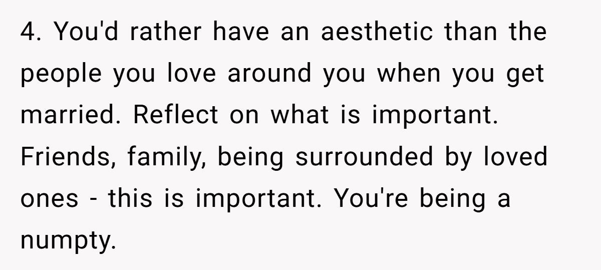 Commenters called the couple “groomzilla” for valuing aesthetics over relationships, urging reflection on what truly matters—family and love