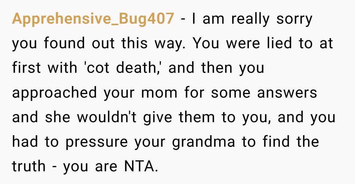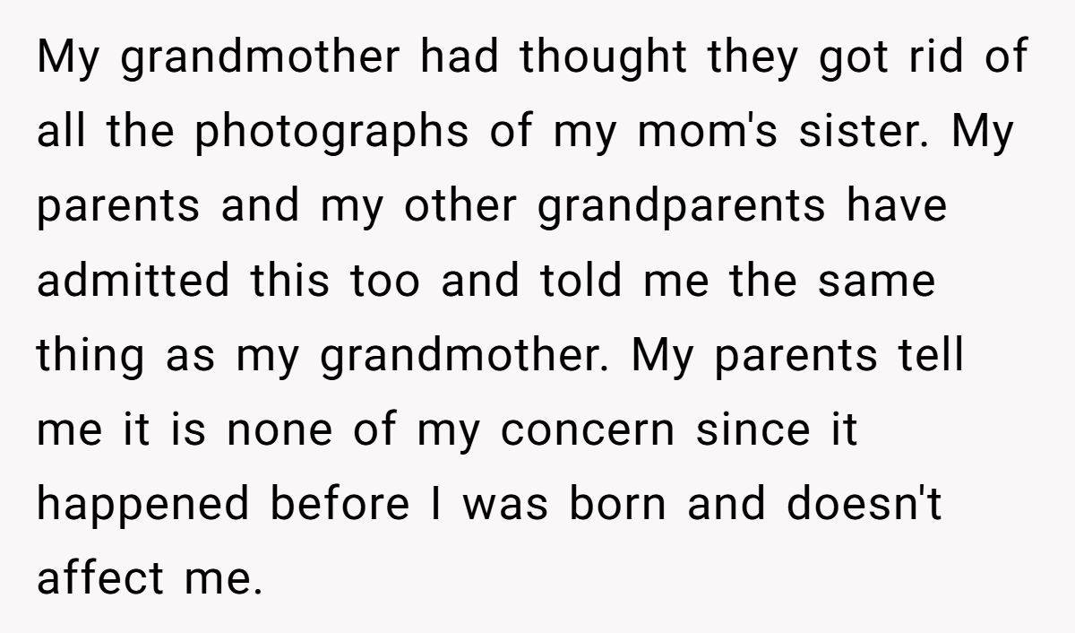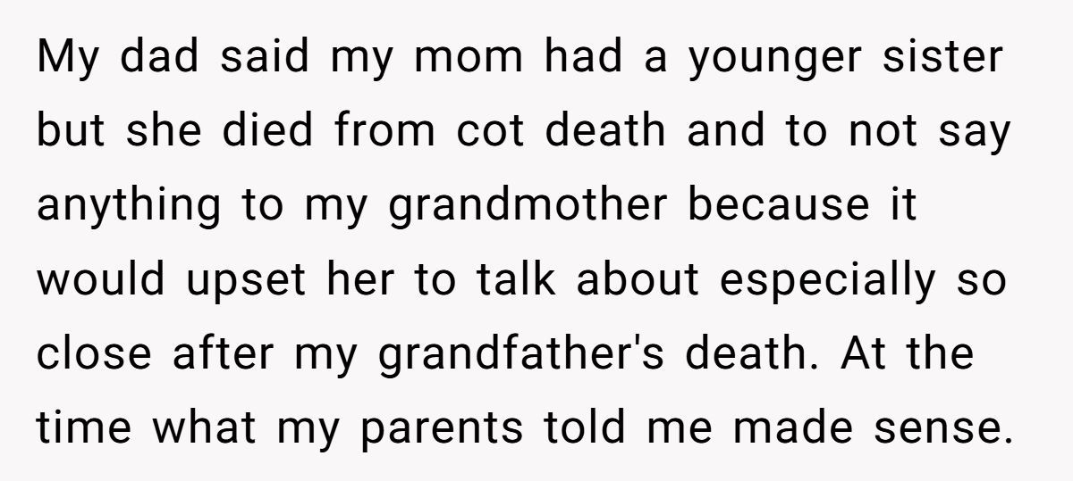 Until that moment, the Redditor had been told their mom’s sister had died of SIDS as a baby. When they confronted their family, they were met with cold avoidance. Their grandmother claimed it wasn’t their concern, and their parents offered no real explanation beyond shame and regret.