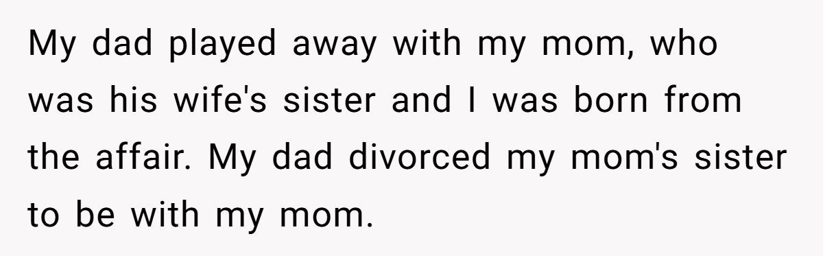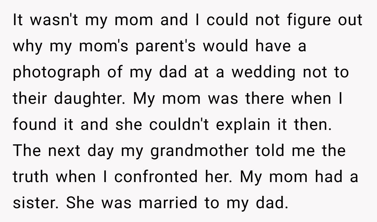 When they asked about it, the truth came pouring out. The woman in the photo was their mom’s older sister, and she had been married to their dad before the affair began. That affair resulted in the birth of the Redditor, tore the family apart, and left the aunt completely cut off and never spoken of again.