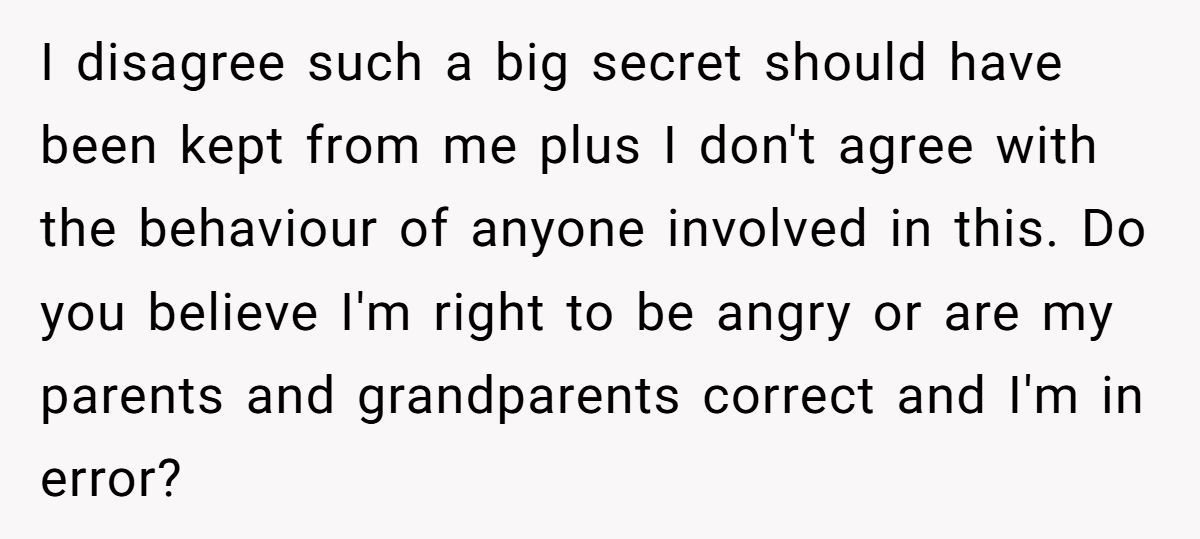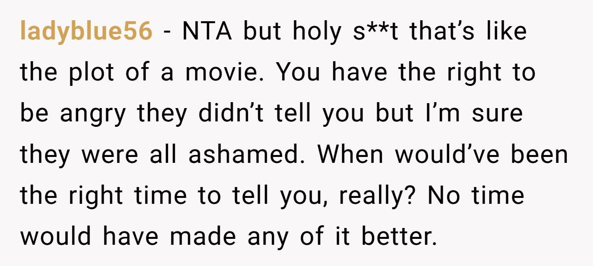 The Redditor’s fury is deeply valid. Discovering that your very existence is tied to a scandal that everyone around you has hidden your entire life is emotionally devastating.