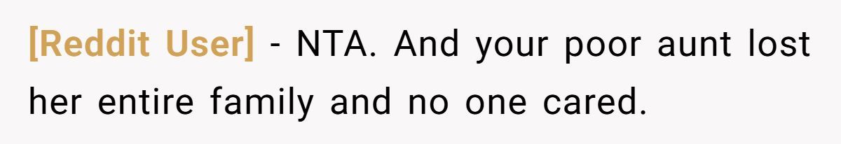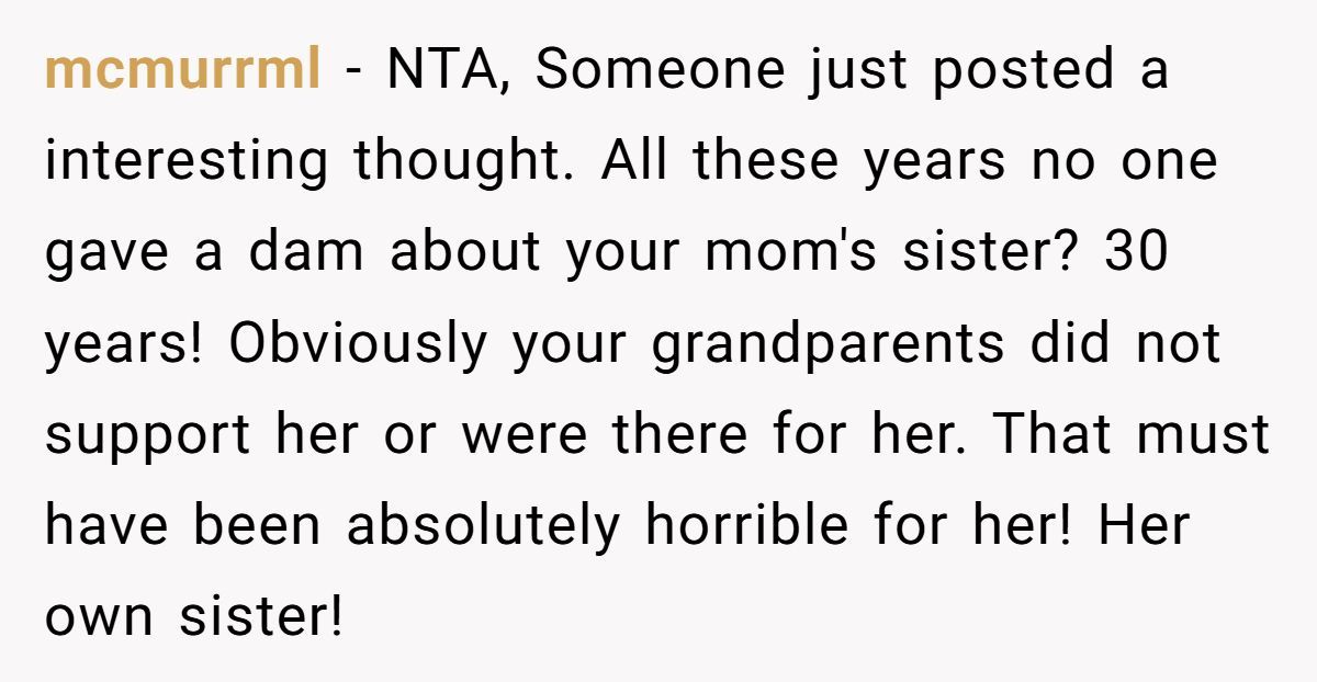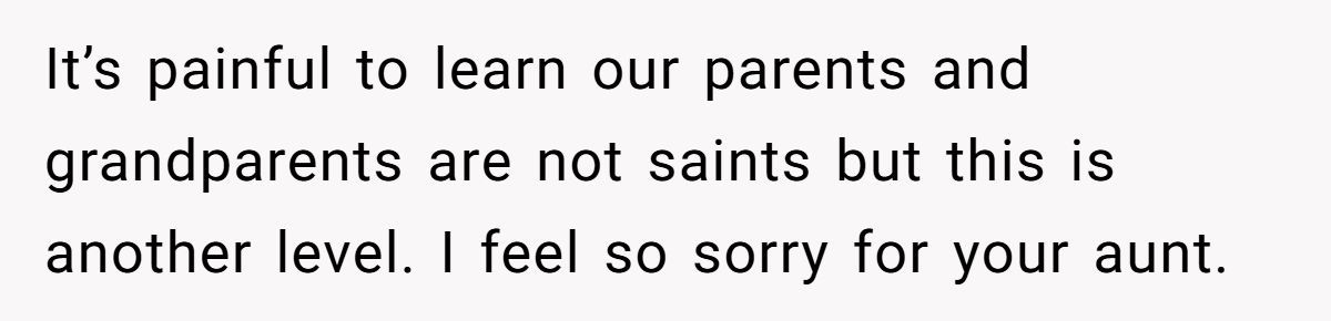 Many redditors pointed out the disturbing double standards and long-buried family secrets—especially how the aunt was abandoned for decades while the rest of the family seemingly turned a blind eye to the real betrayal.