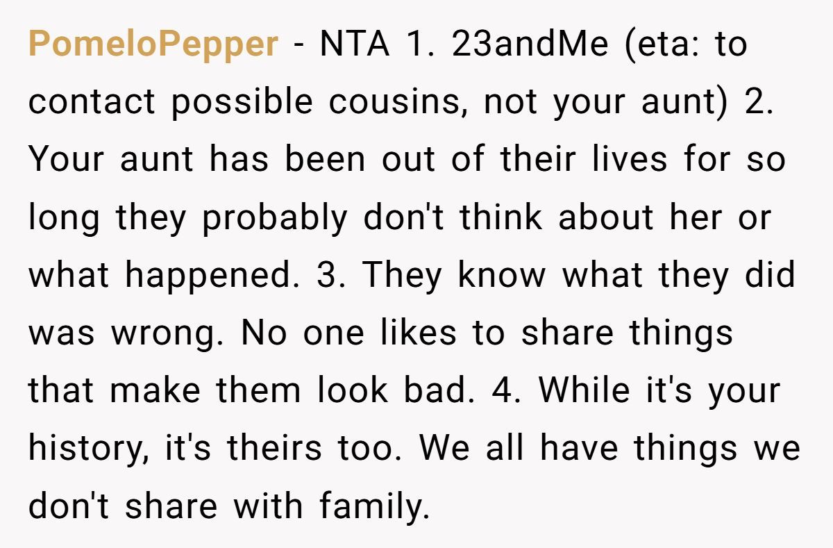 Tools like DNA testing or online genealogy platforms may help the Redditor reconnect with their estranged aunt or find more pieces of the truth. But emotionally, they’ll need time, space, and likely professional help to work through the betrayal.
